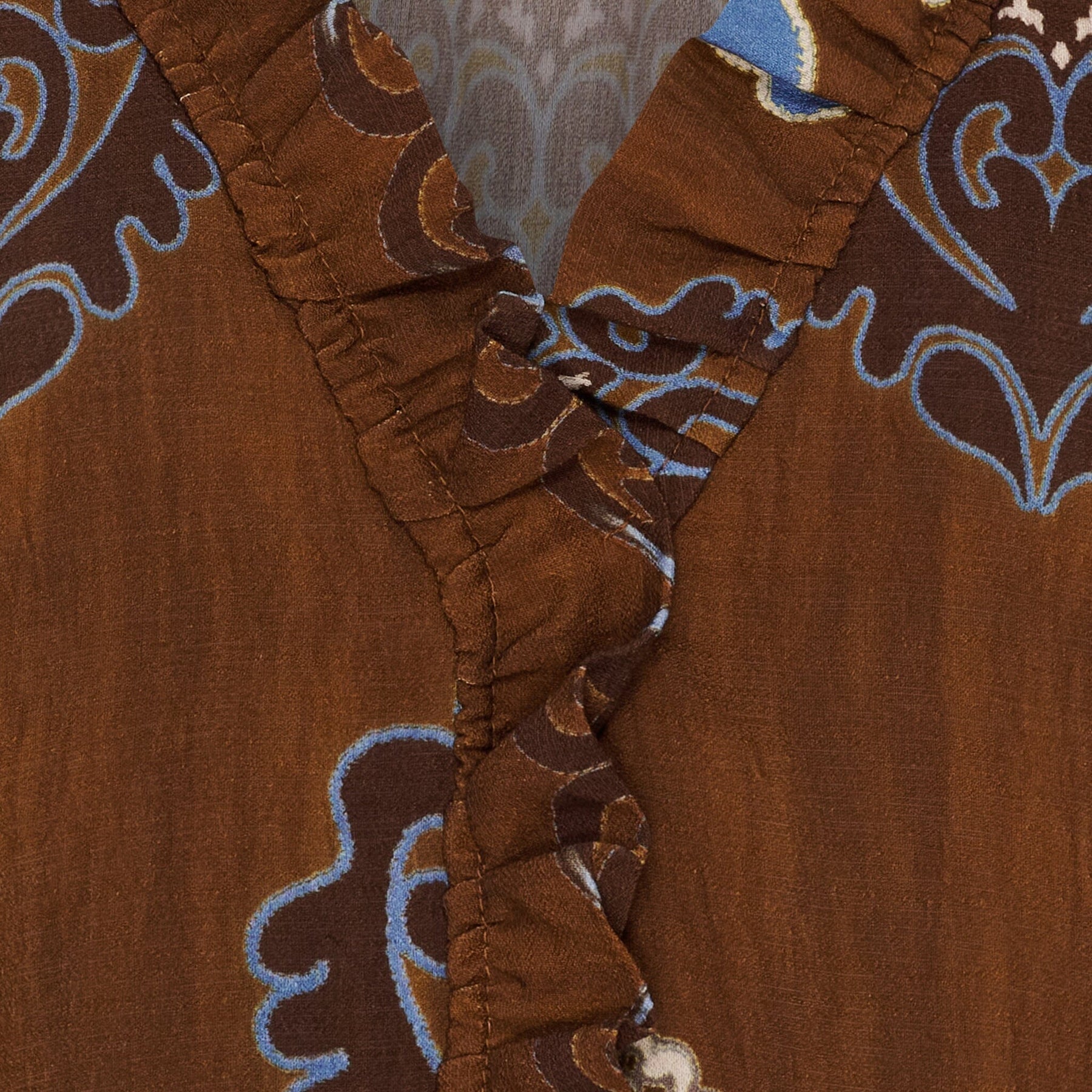 Brun skjorte fra Marta Du Chateau med paisley-mønster i blå og hvide nuancer. Skjorten har en løs pasform med V-hals og rynkede detaljer langs frontåbningen.