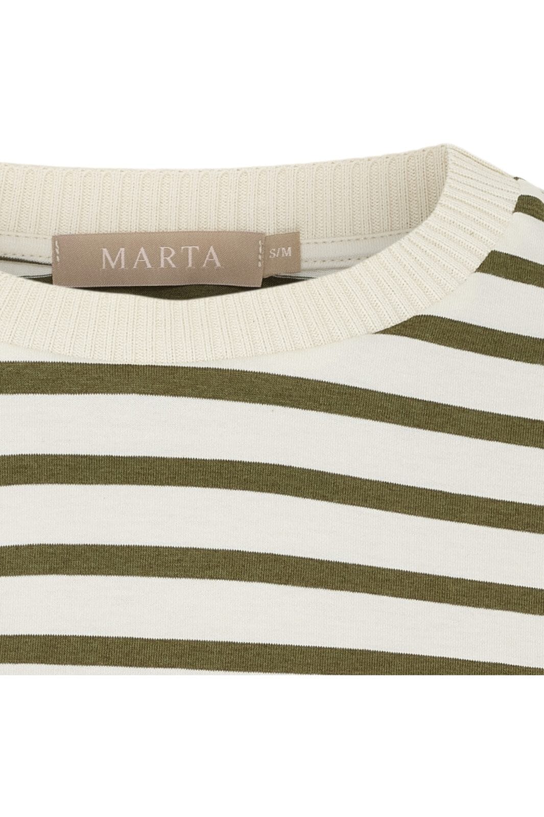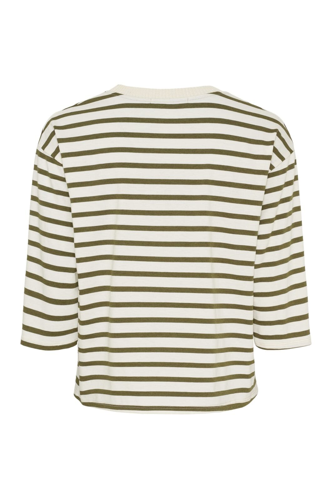 Stribet t-shirt fra Marta Du Chateau med beige og militærgrønne striber. T-shirten har en løs pasform med 3/4-ærmer og rund hals.
