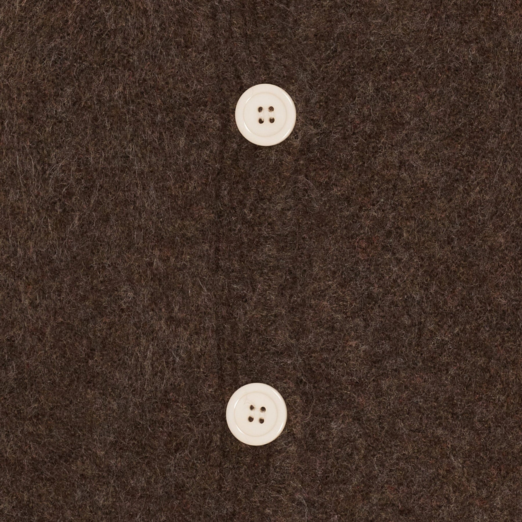 Brun striktrøje fra Marta Du Chateau med beige manchetter og knapper langs fronten. Et lille hjertemotiv sidder på venstre side af brystet.