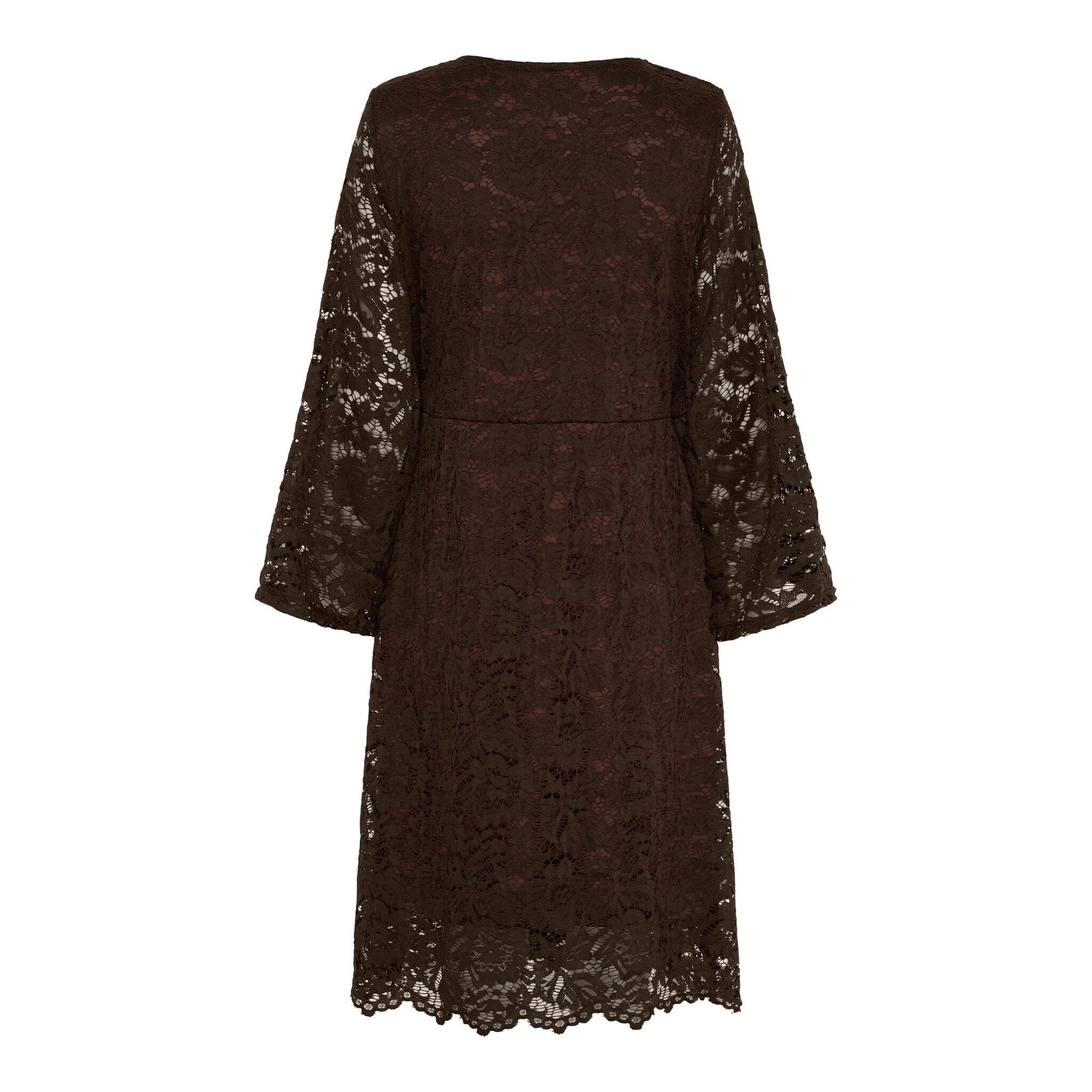 Brun knælang kjole fra Marta Du Chateau med blondeoverflade. Kjolen har V-udskæring og 3/4-ærmer samt bindebånd i siden, der giver en slankende snitføring.