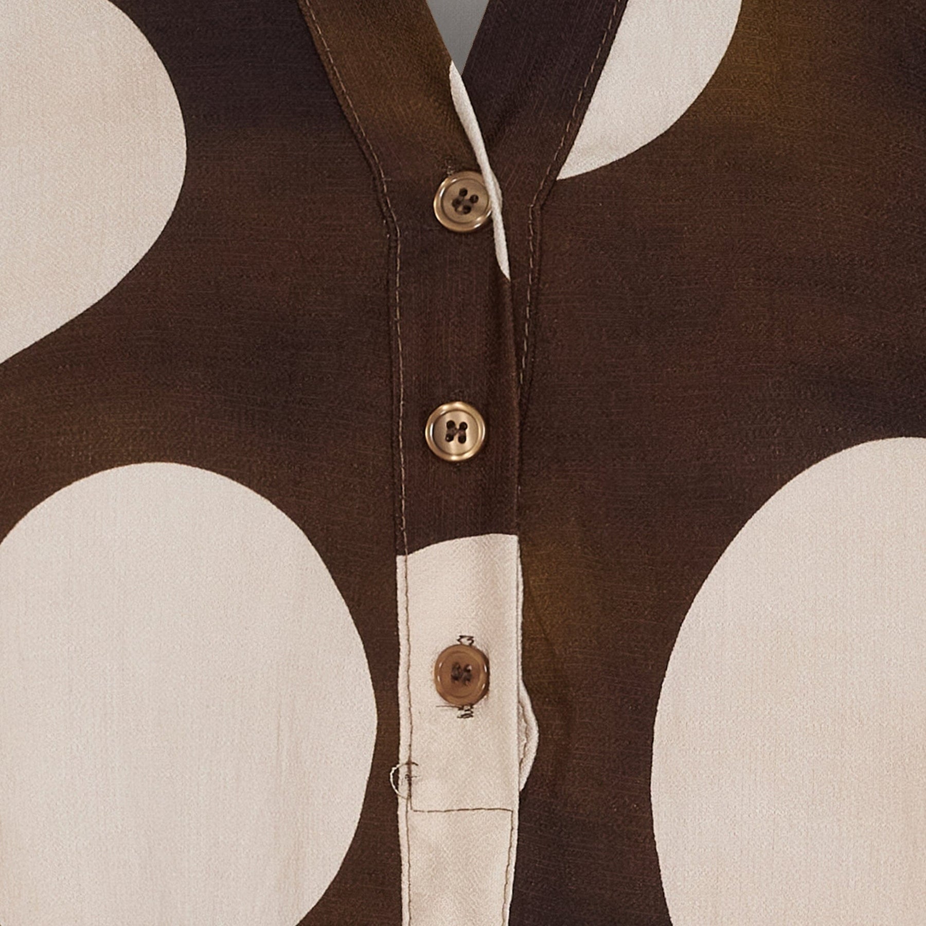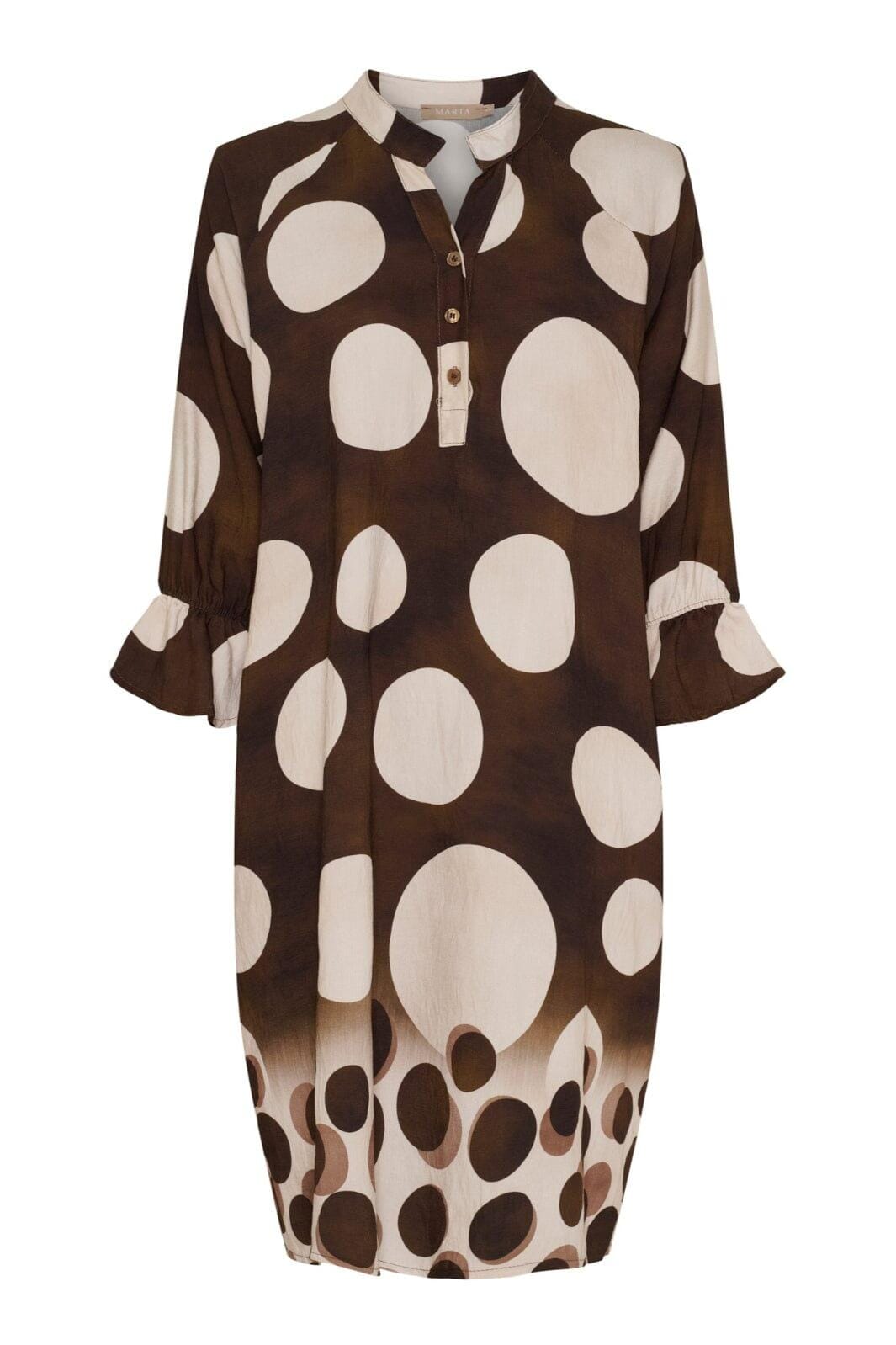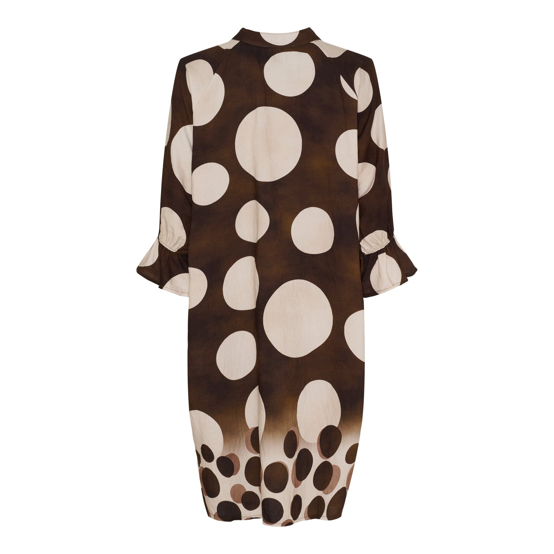 Brun kjole fra Marta Du Chateau med store, lyse prikker på mørk bund. Kjolen har skjortekrave og 3/4-ærmer med flæsedetaljer ved manchetterne.