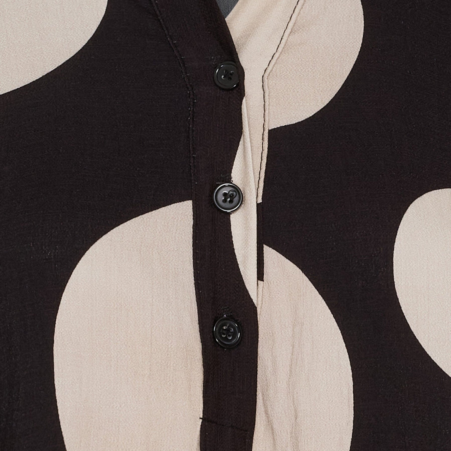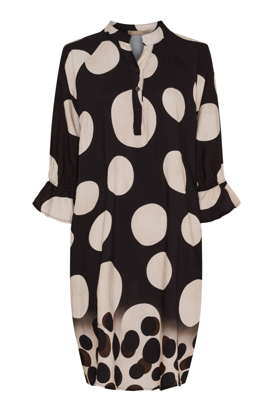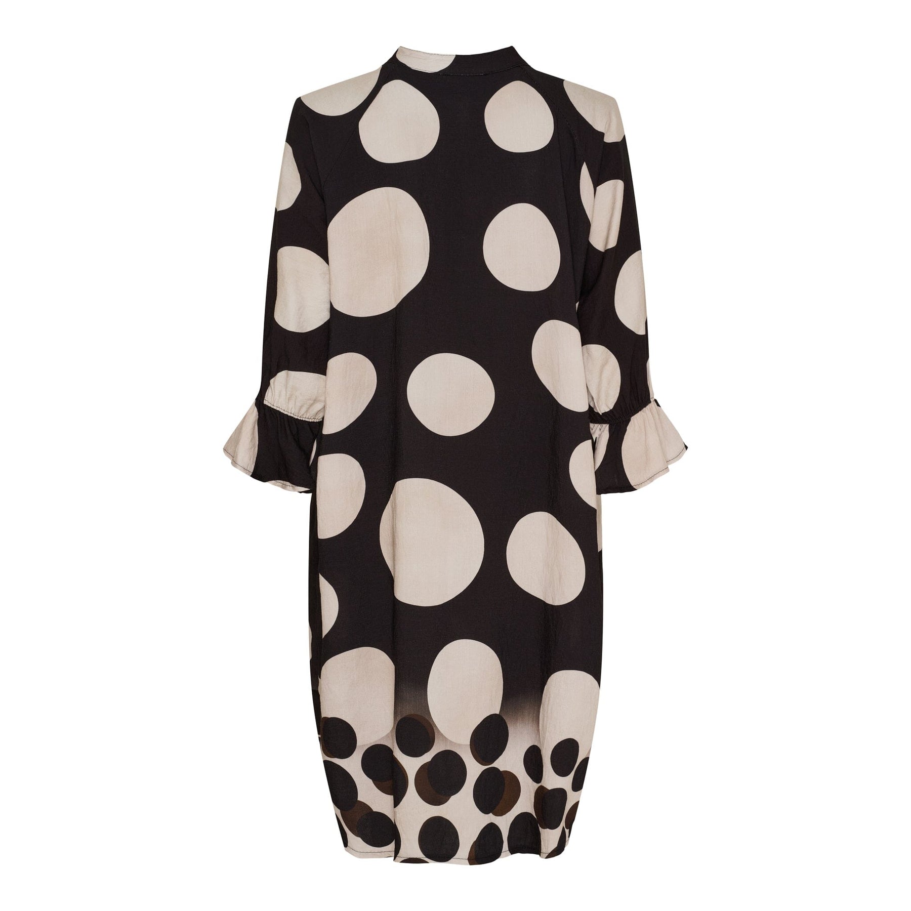 Sort kjole fra Marta Du Chateau med store beige prikker. Kjolen har en løs pasform og går til knæet. Den er lavet med trekvartlange ærmer og en skjortekrave med knapper.