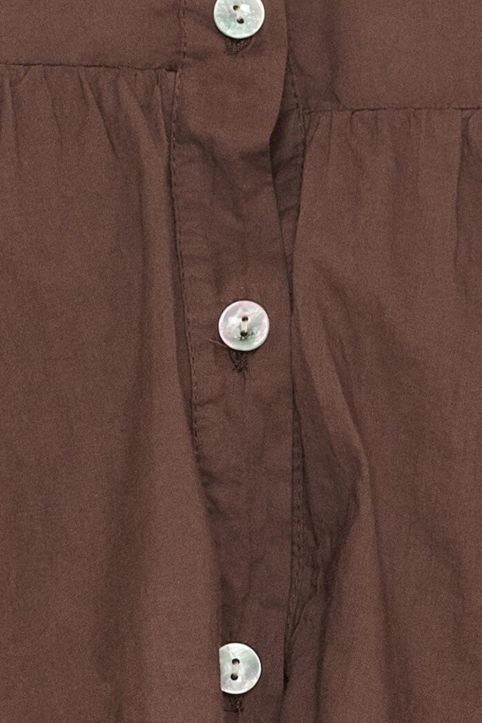 Brun bluse fra Marta Du Chateau i 100 % bomuld. Designet med flere lag flæser og volanter på forsiden. Den har en stor pasform med lange ærmer og rynkedetaljer.