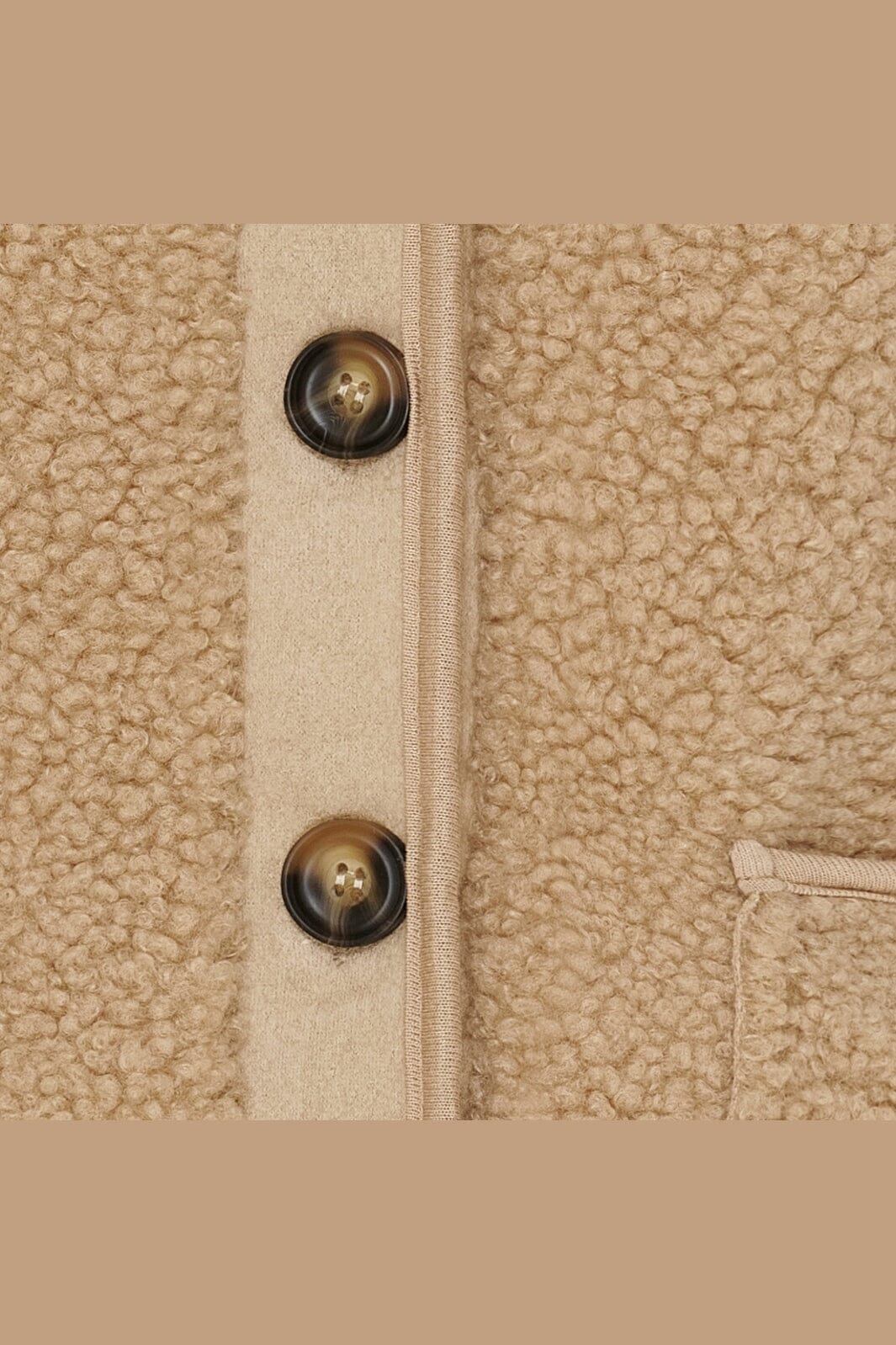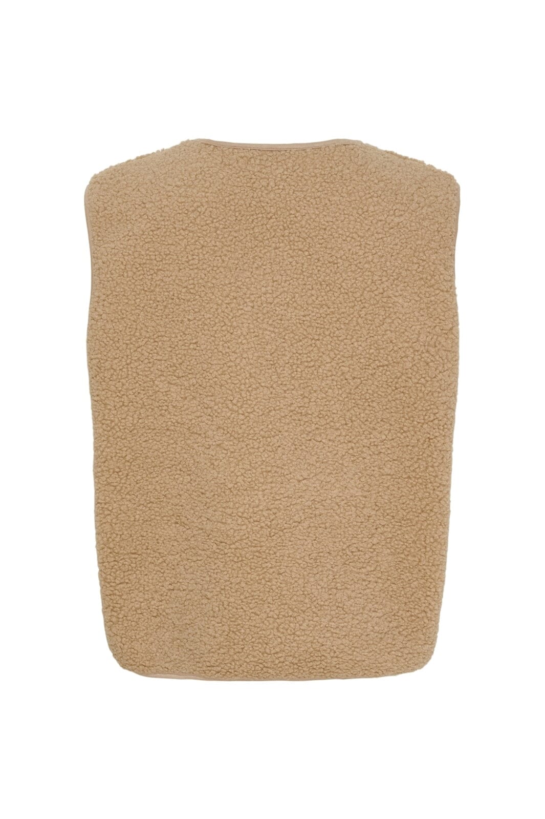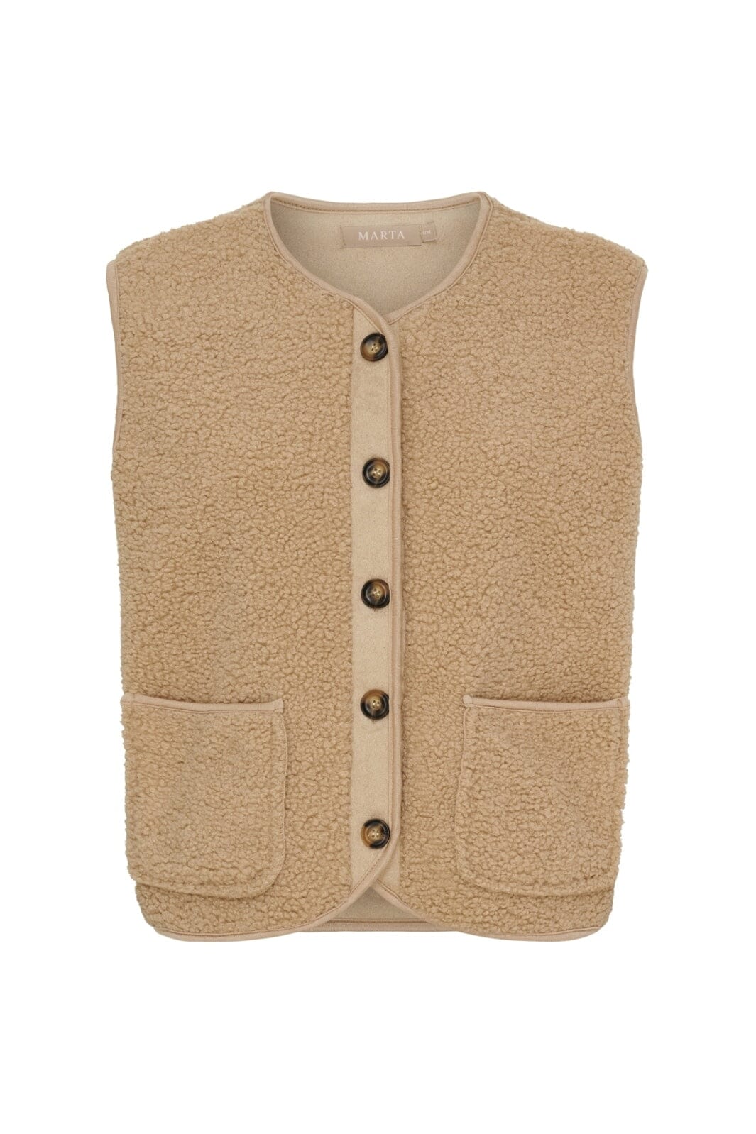 Vest fra Marta Du Chateau i camel-farve med blødt teddy-lignende materiale. Den har en praktisk knaplukning og to rummelige lommer foran.