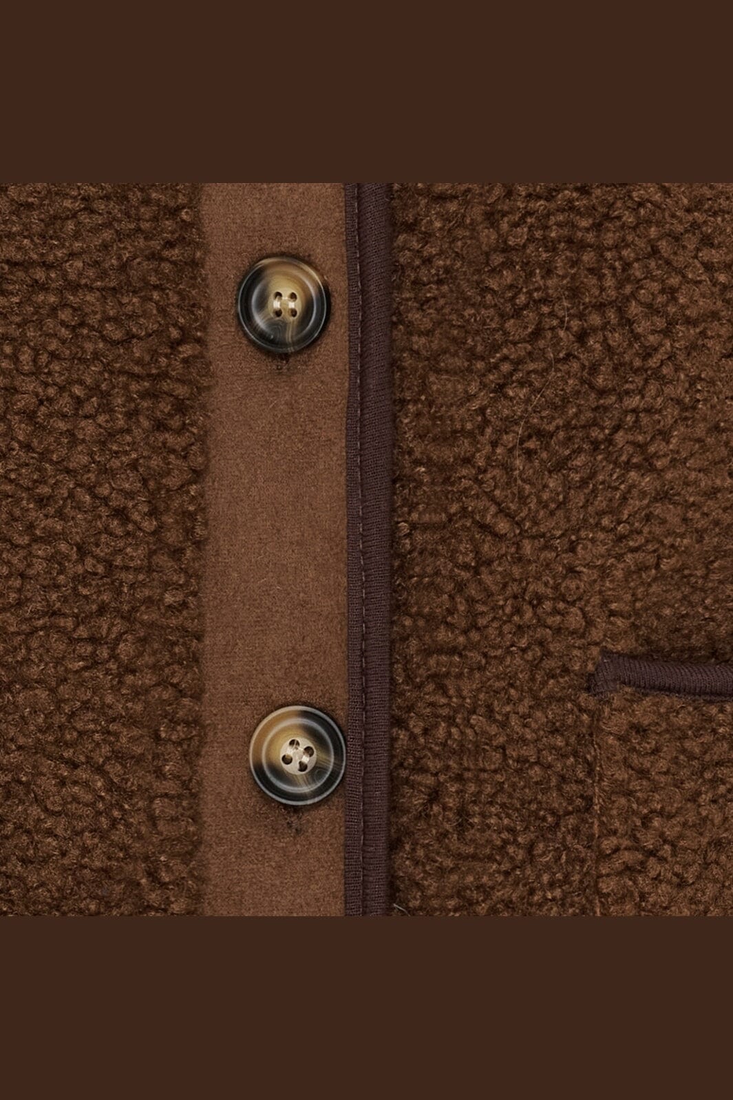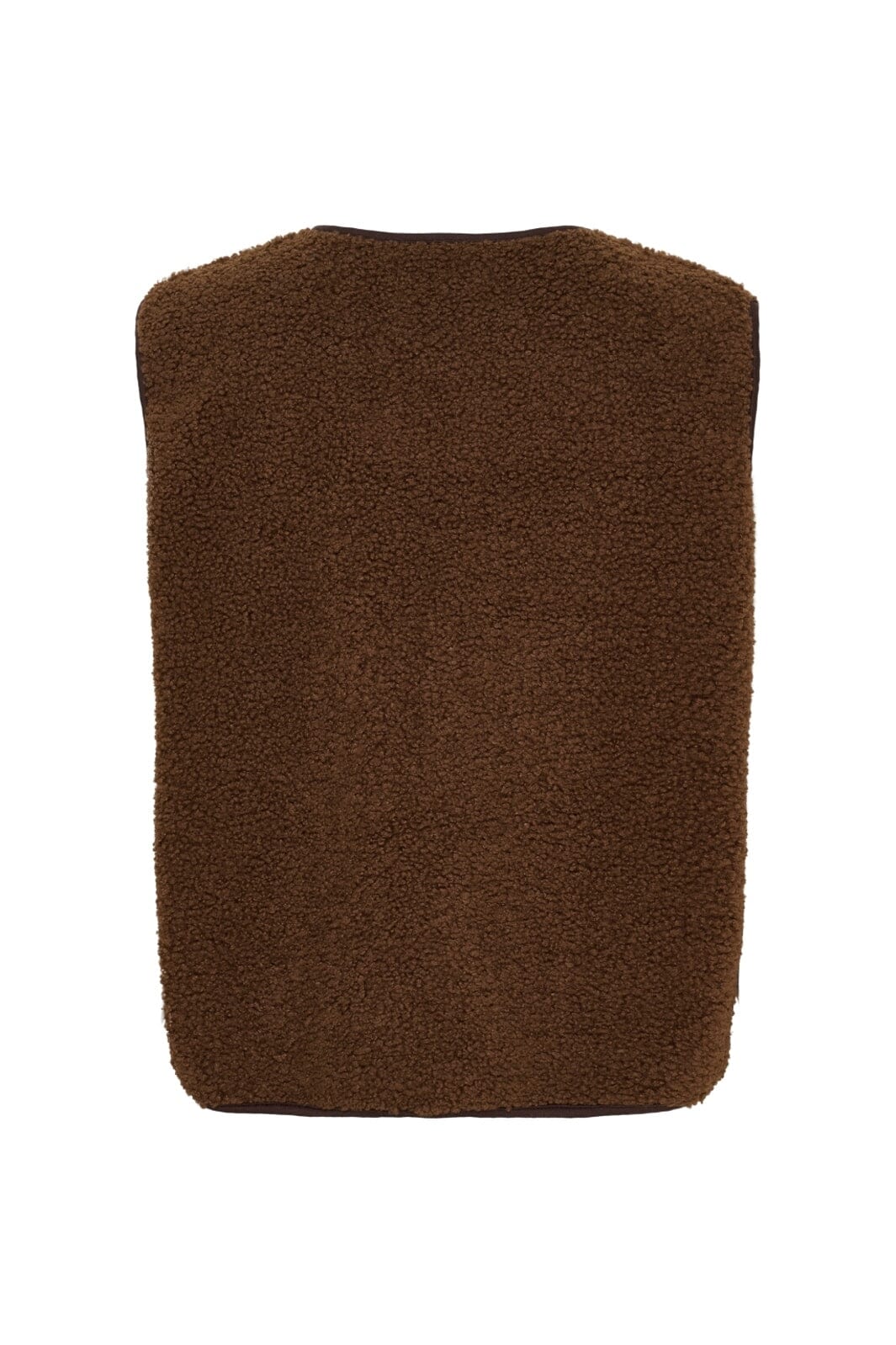 Brun vest fra Marta Du Chateau med struktureret overflade. Den har runde knapper i midten og to praktiske lommer på forsiden. Vesten er ærmeløs med rund halsudskæring.