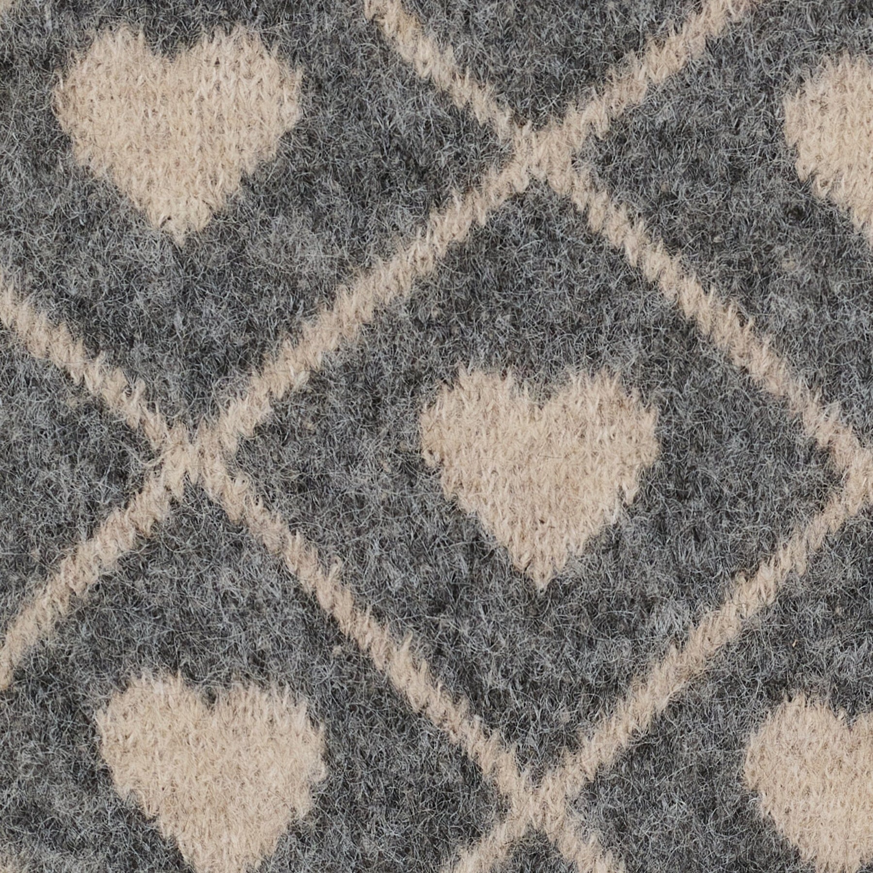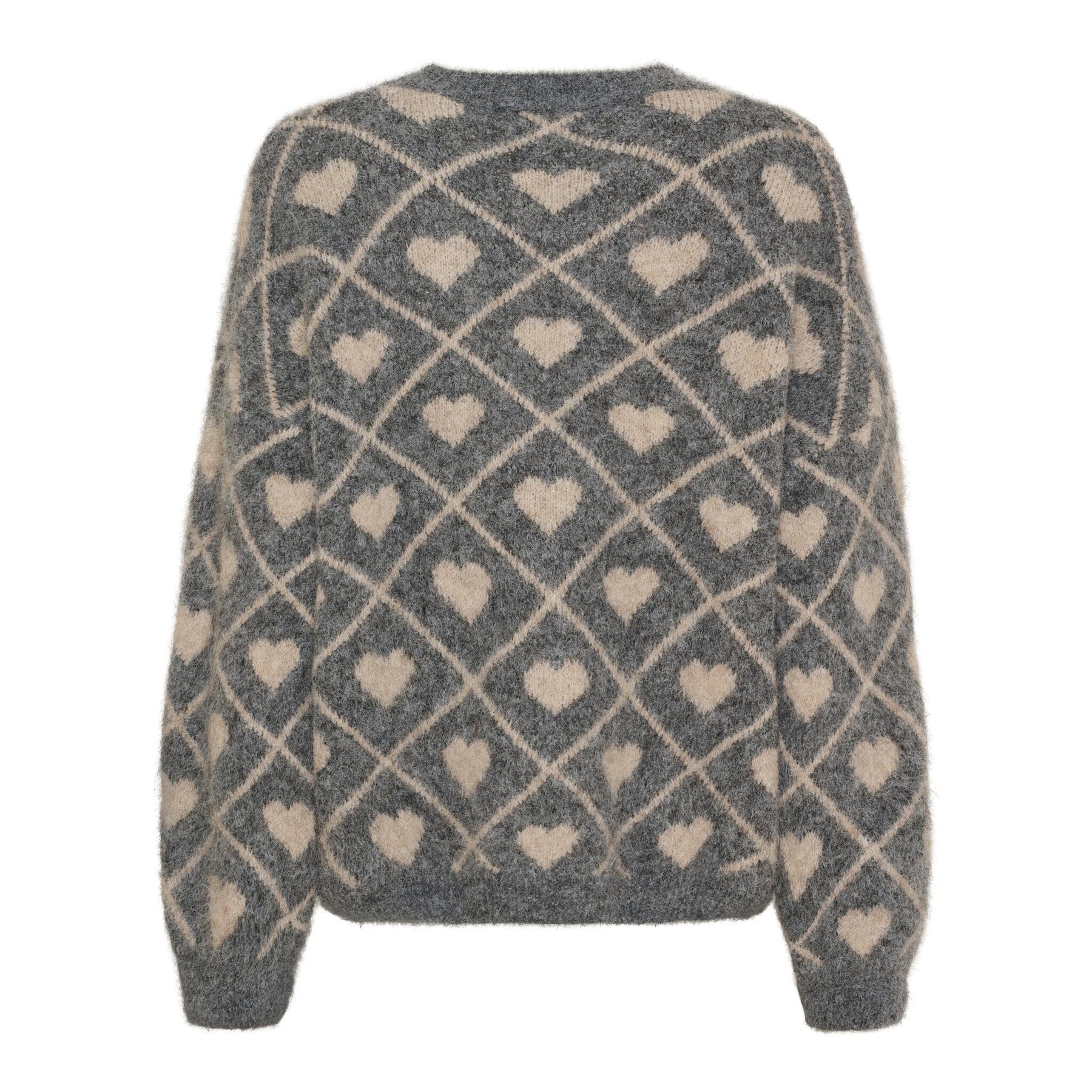 Grå striktrøje fra Marta Du Chateau med beige hjerter og diamantmønster. Den runde halsudskæring og de lange ærmer giver sweateren en klassisk form.