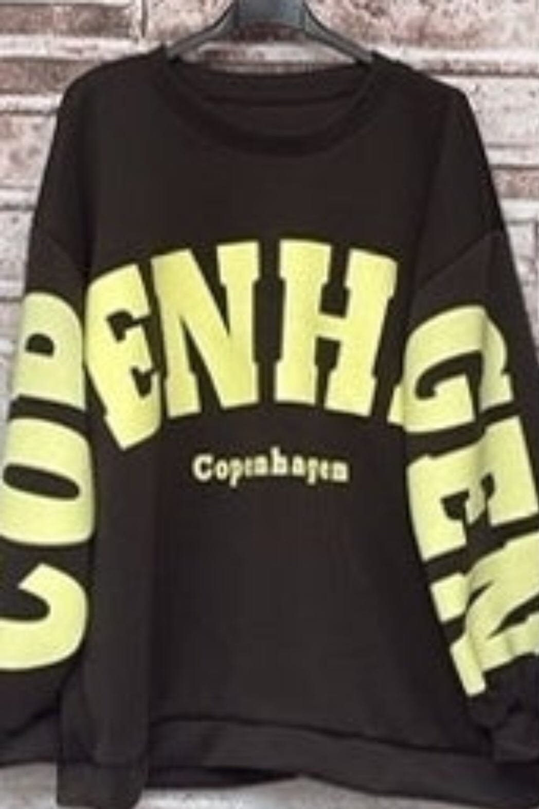 Brun sweatshirt fra Marta Du Chateau med rund hals og oversized pasform. Den har store gule bogstaver på fronten og ærmerne med teksten COPENHAGEN.