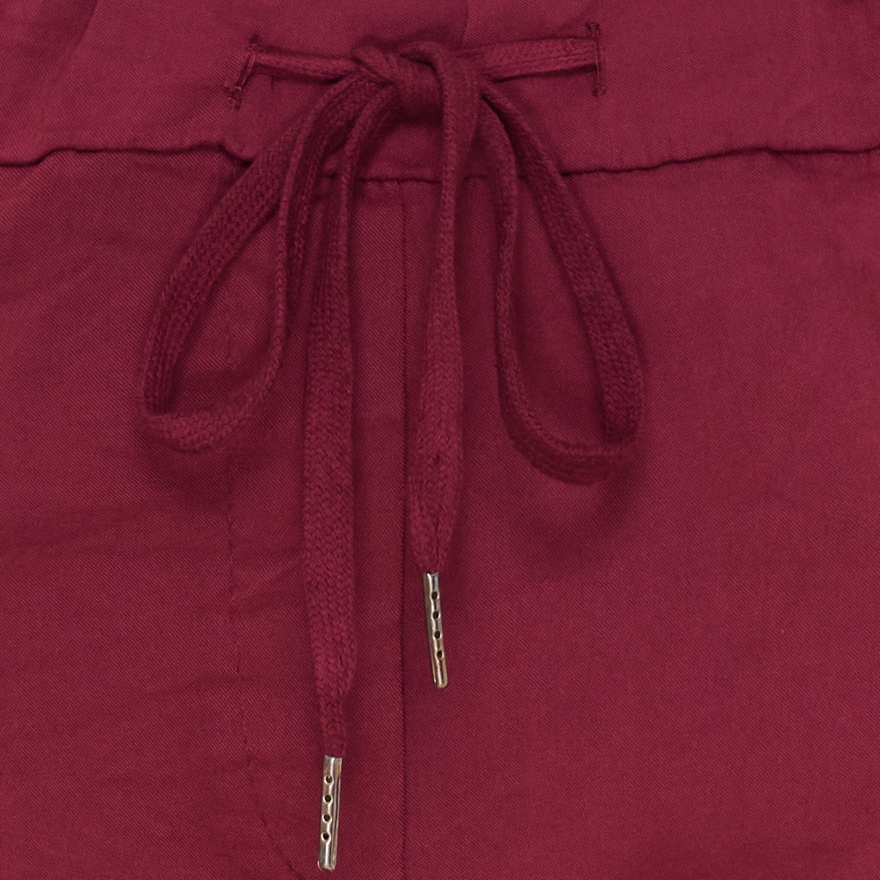 Bordeauxfarvede bukser fra Marta Du Chateau med snøre i taljen. Bukserne har en regulær pasform og to forlommer. De er i ankellængde med opsmøgede bukseben.