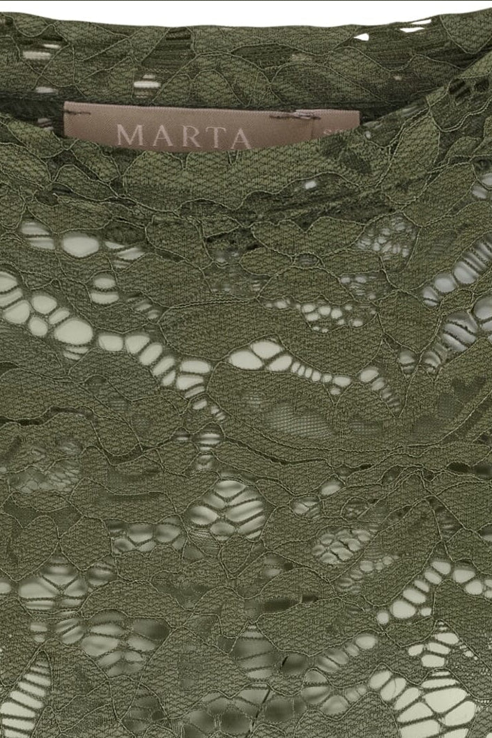 Langærmet t-shirt fra Marta Du Chateau i militærgrøn med et blomstret blondemønster over hele blusen. Blusen har en rund hals og skulpturerede kanter.