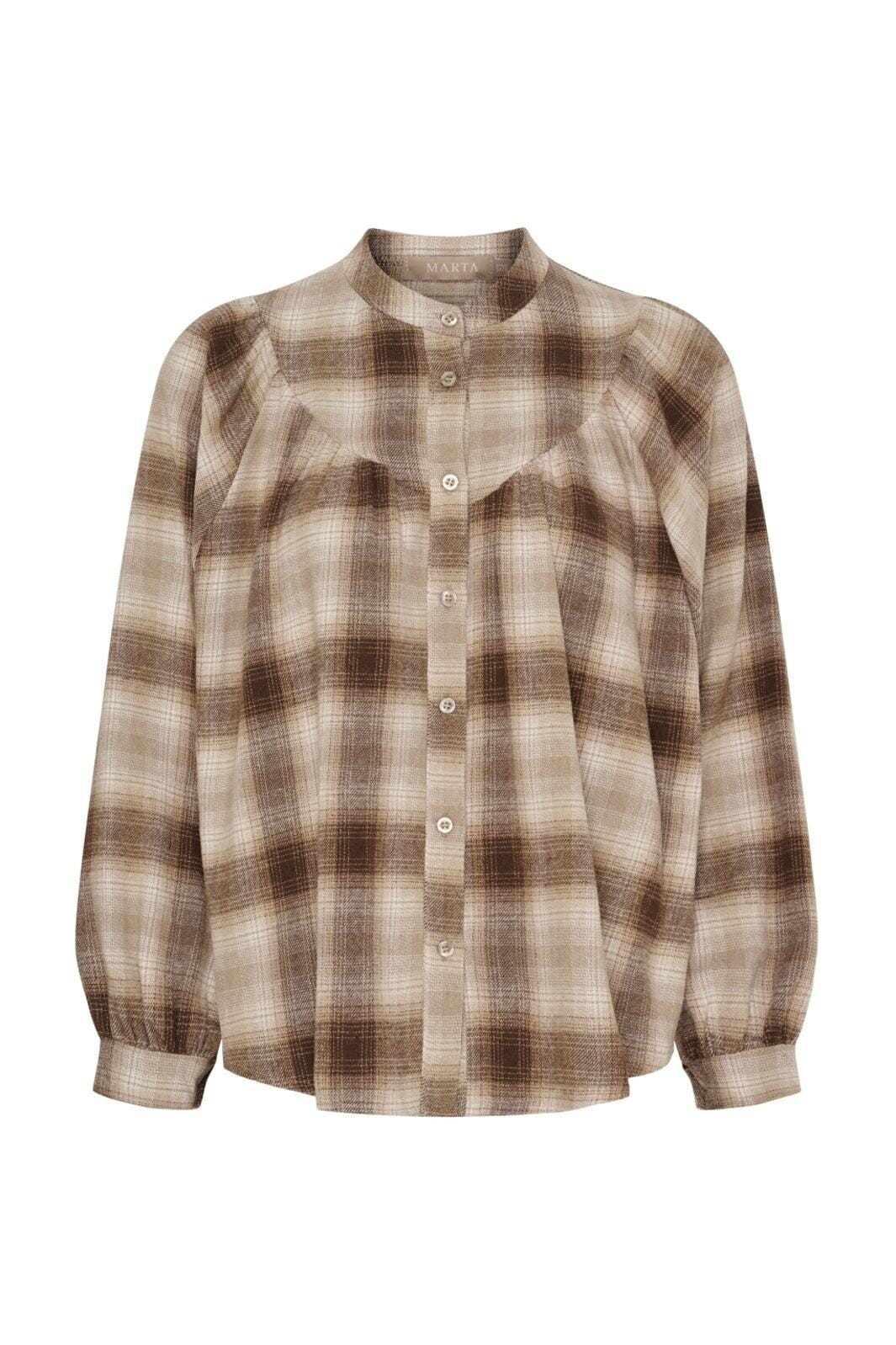 Beige skjorte fra Marta Du Chateau med et ternet mønster. Skjorten har en løs pasform og lange ærmer med flæsedetaljer ved manchetterne.