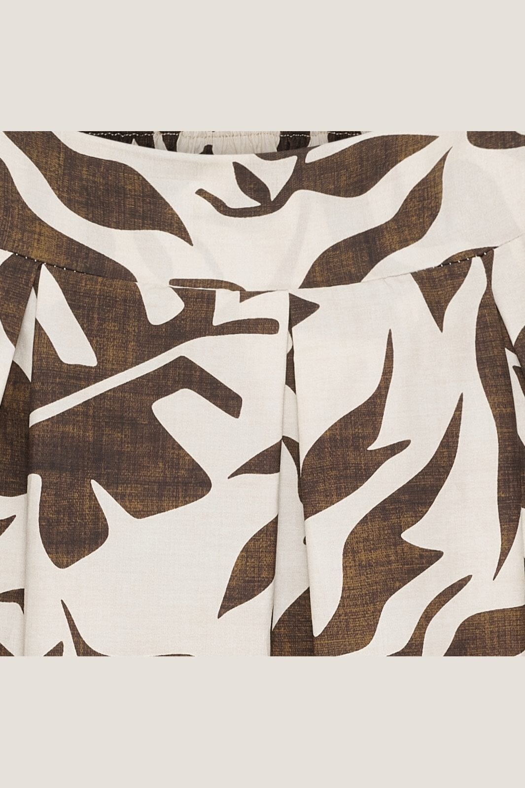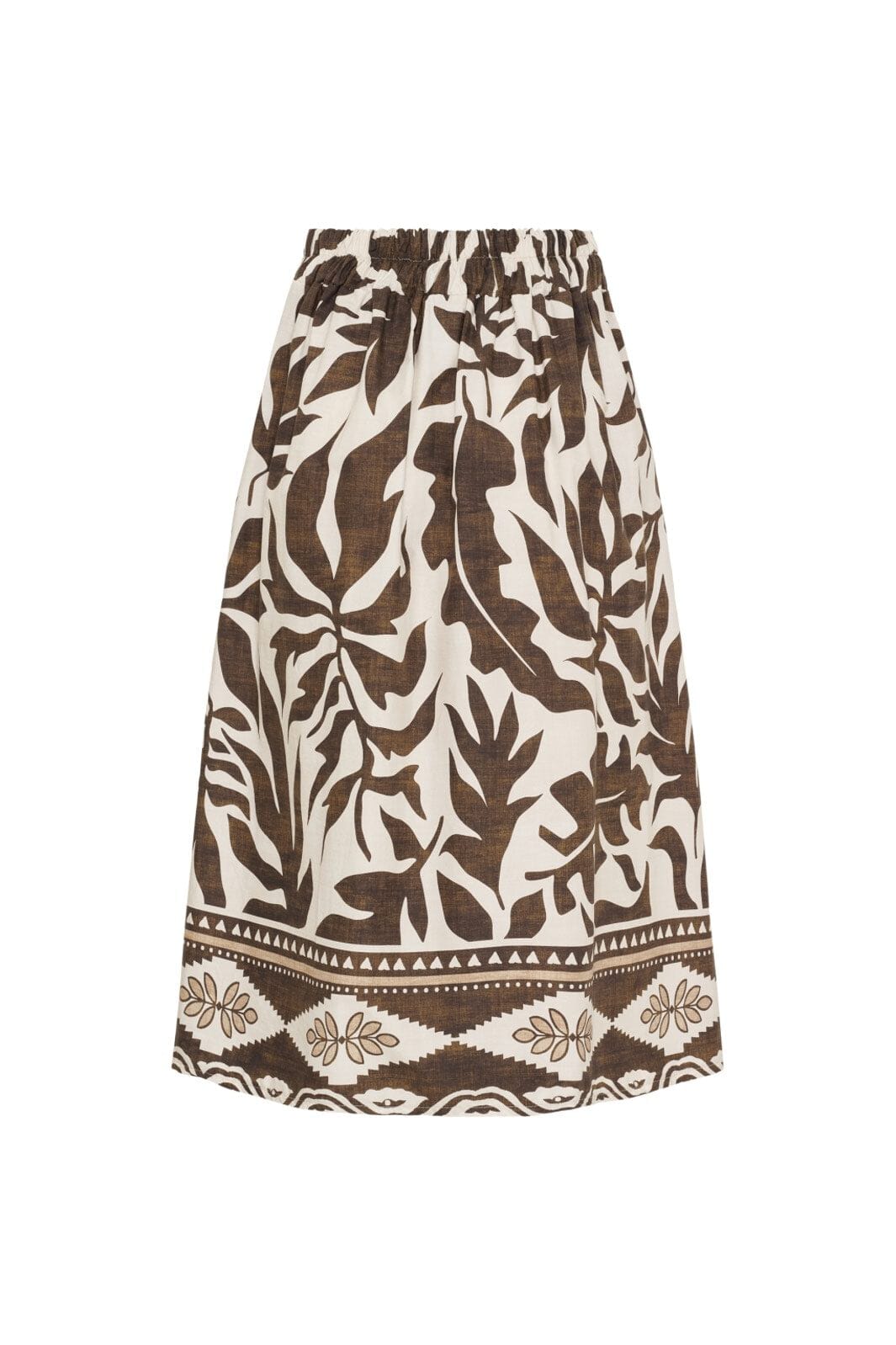 Brun og cremehvid nederdel fra Marta Du Chateau med bladmønster og dekorativ kant forneden. Den har høj talje og løs pasform i kalvelængde.