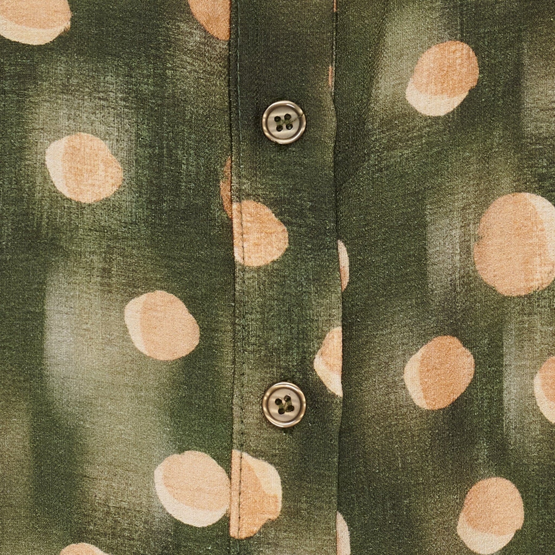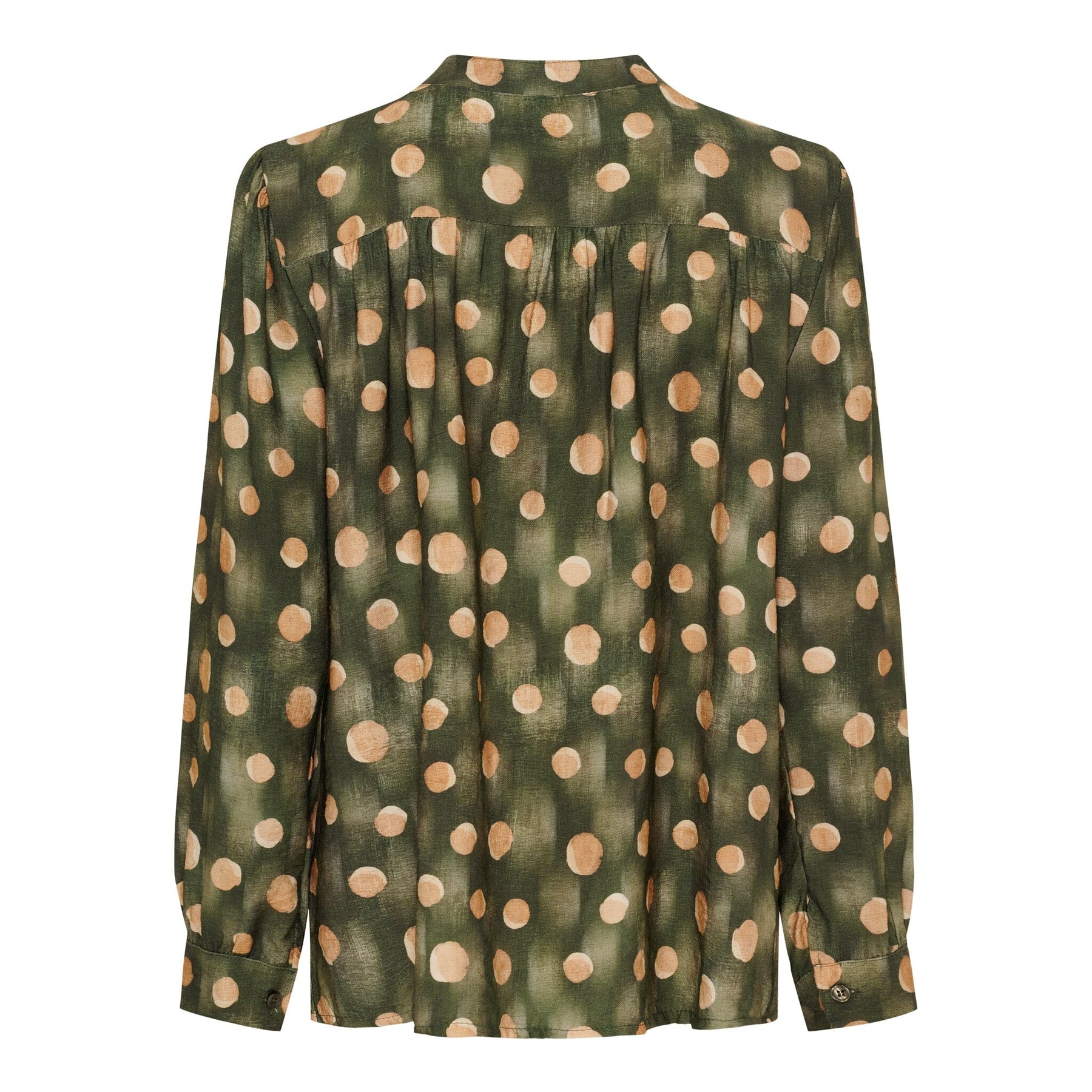 Skjorte fra Marta Du Chateau i militærgrøn med lyse polkaprikker. Den løse model har skjortekrave, knapper hele vejen ned og lange ærmer.