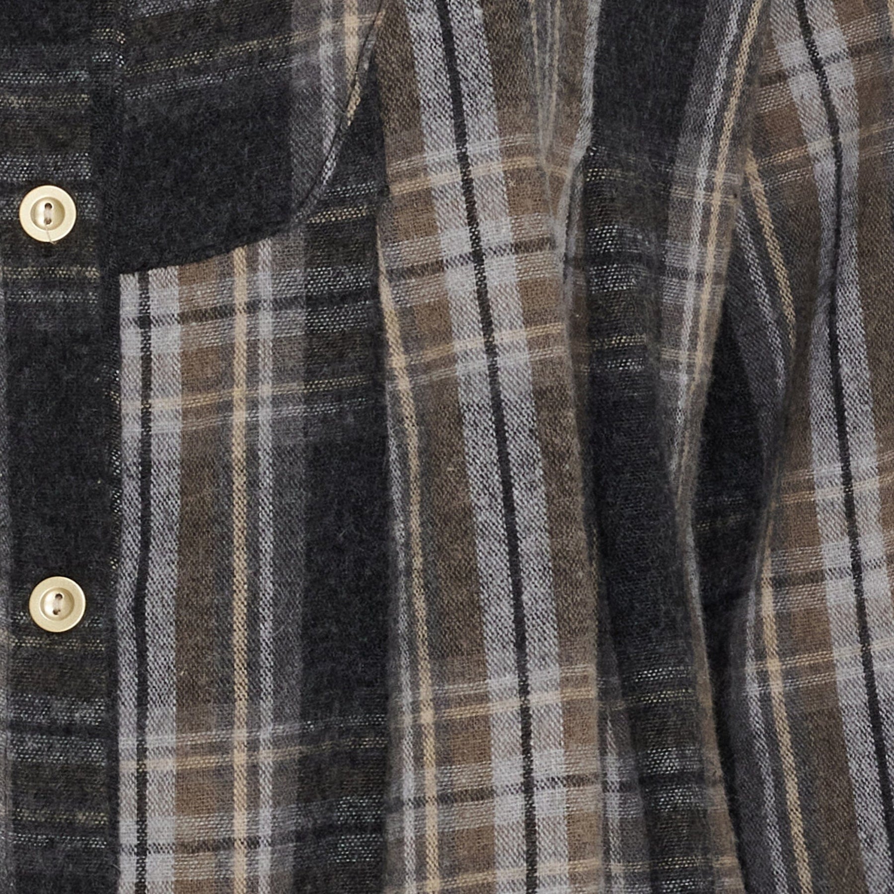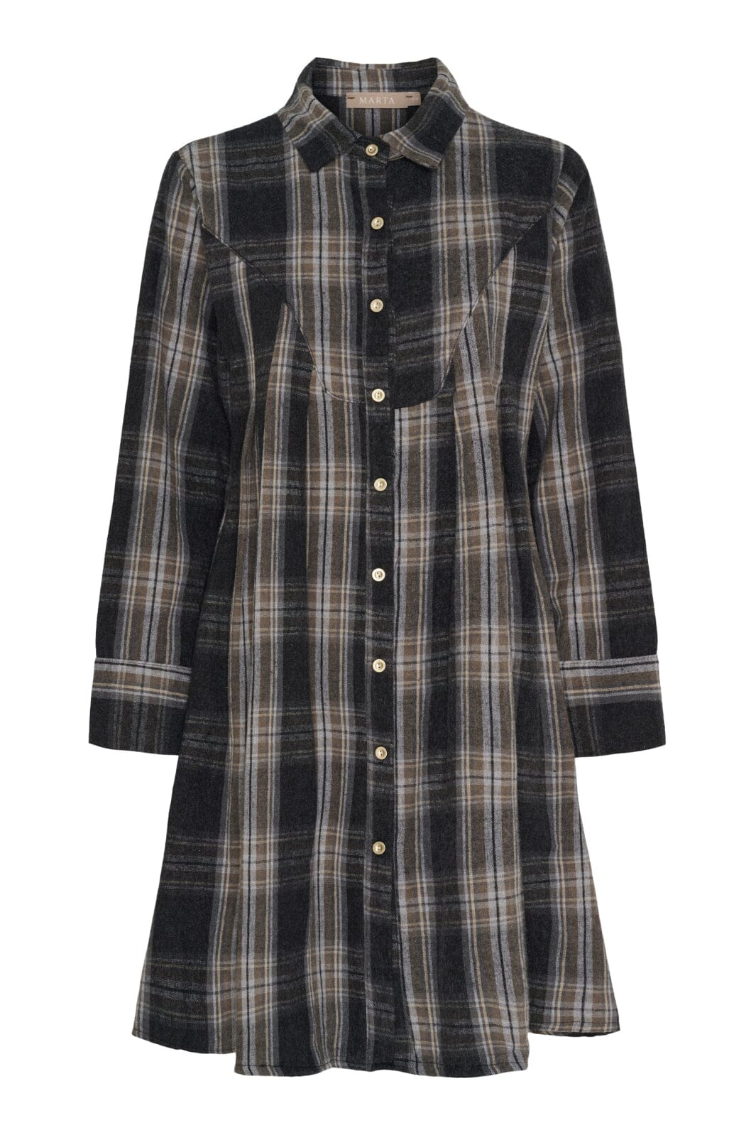 Grå, ternet kjole fra Marta Du Chateau med skjortekrave og knaplukning foran. Kjolen har 3/4 ærmer og rynker, der giver den et feminint udtryk.