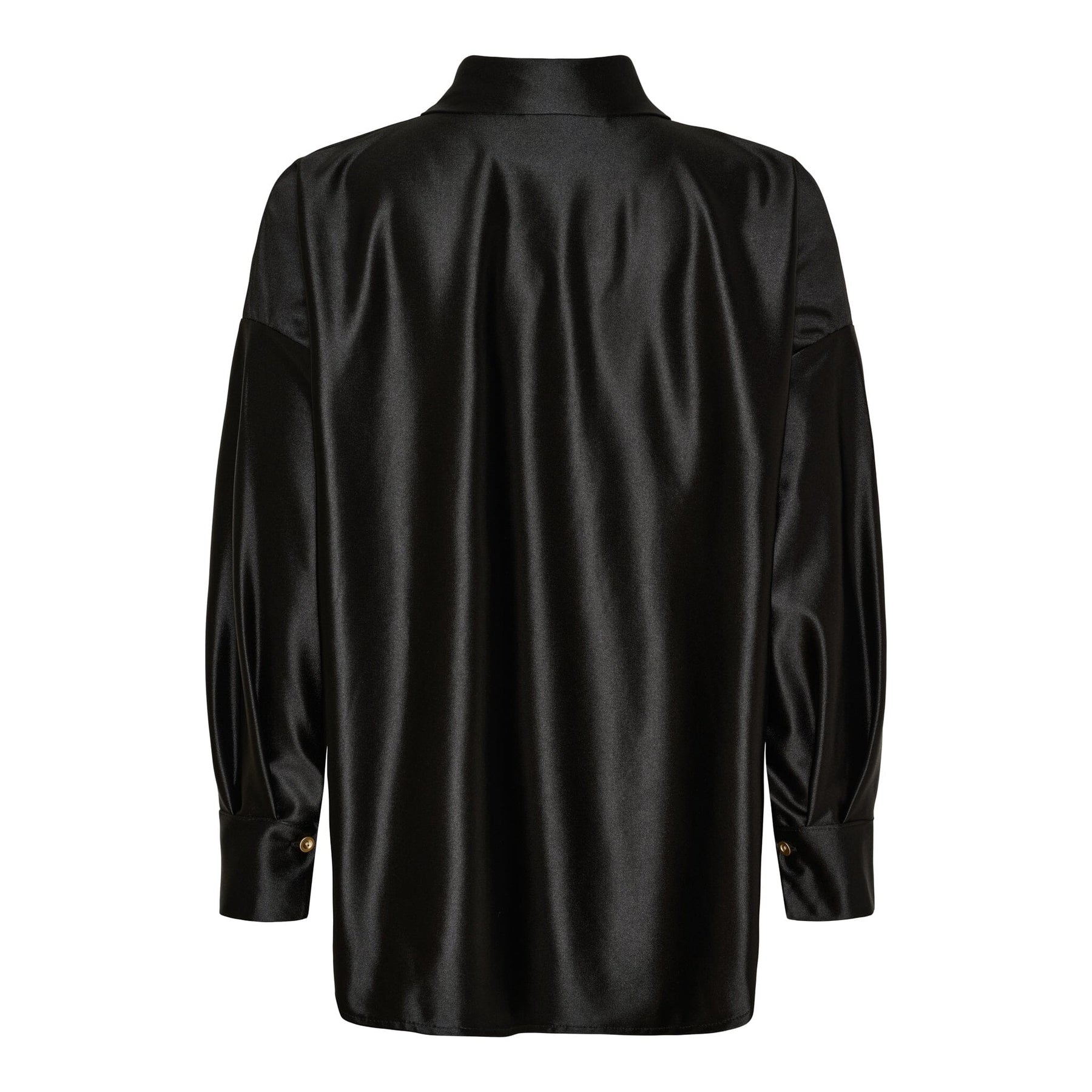 Sort skjorte fra Marta Du Chateau med skinnende overflade. Skjorten har klassisk skjortekrave, oversized pasform og lange ærmer med knaplukning.