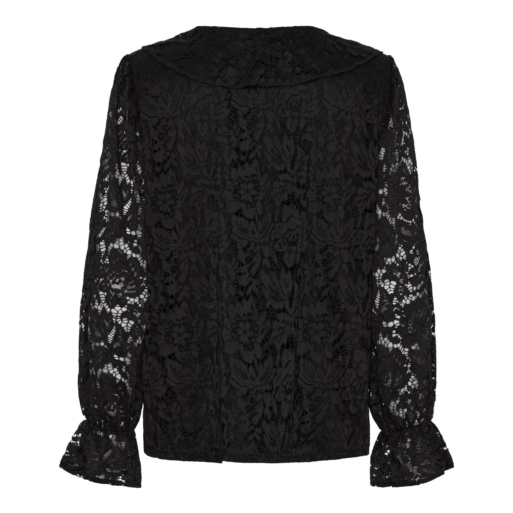 Sort blondebluse fra Marta Du Chateau med V-udskæring og flæser. Blusen har lange ærmer med blondedetaljer og passer til både formelle og afslappede sammenhænge.