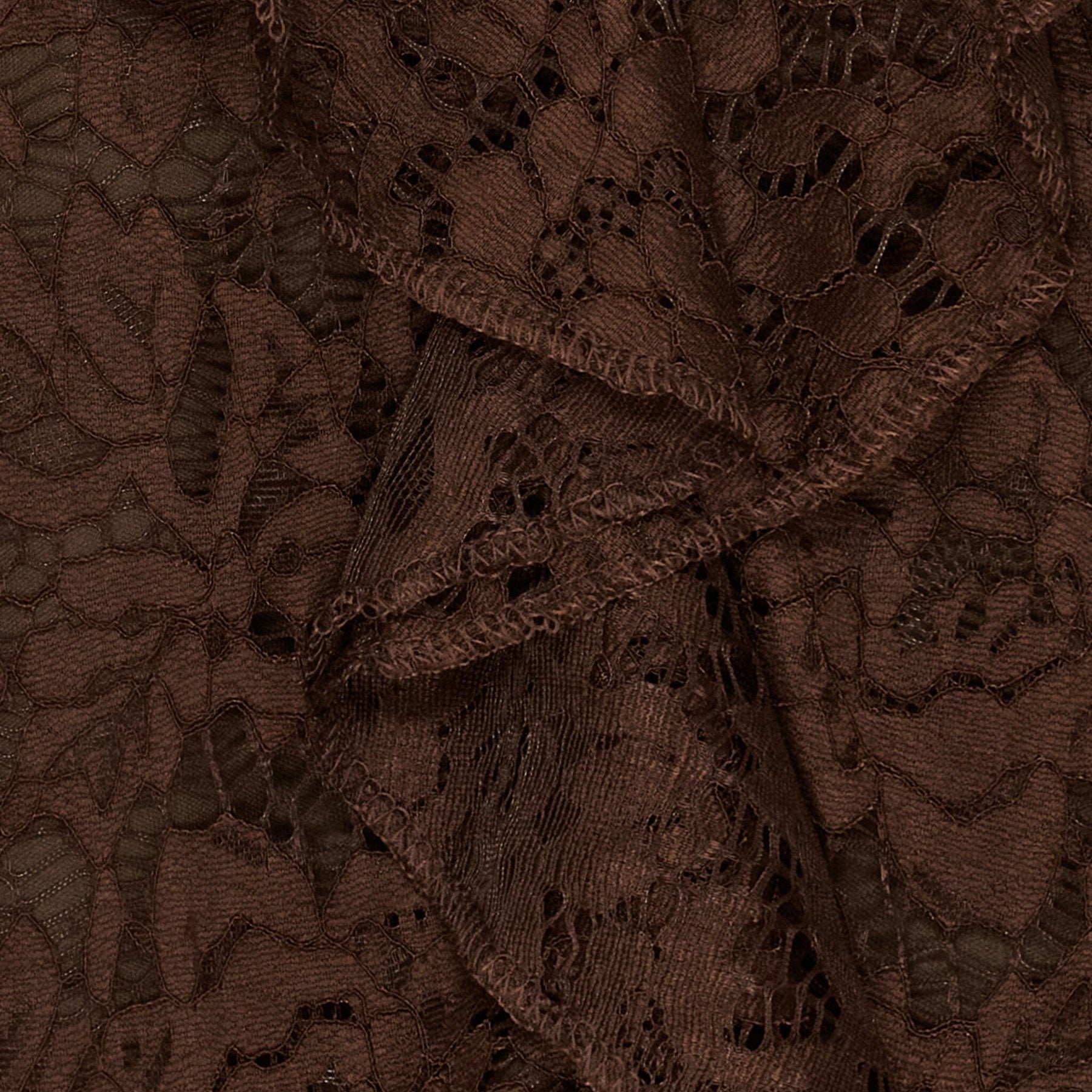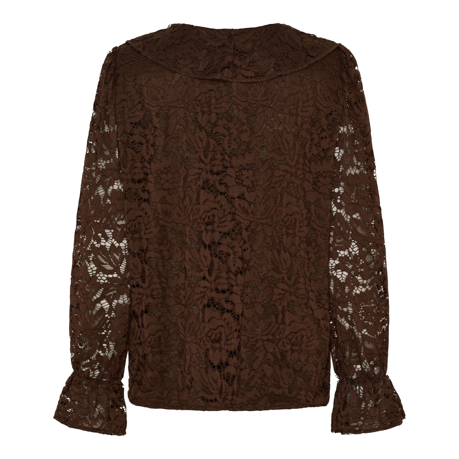 Brun blondebluse fra Marta Du Chateau med blomstermønster og flæsedetaljer. Blusen passer til både formelle og afslappede lejligheder samt festlige anledninger.