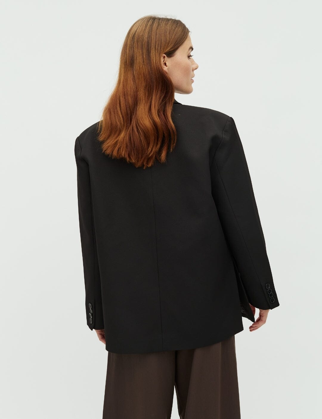 Sort blazer fra MbyM, lavet af polyester. Blazeren har notch-lapel-design, flaplommer foran og en lang længde under taljen.