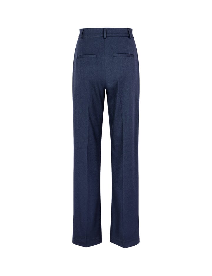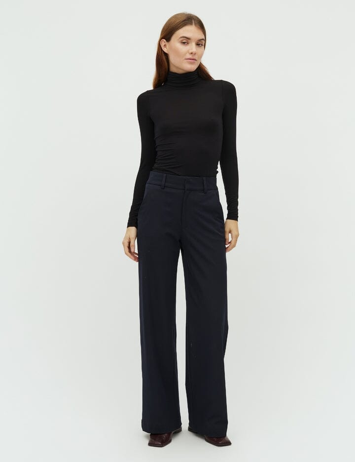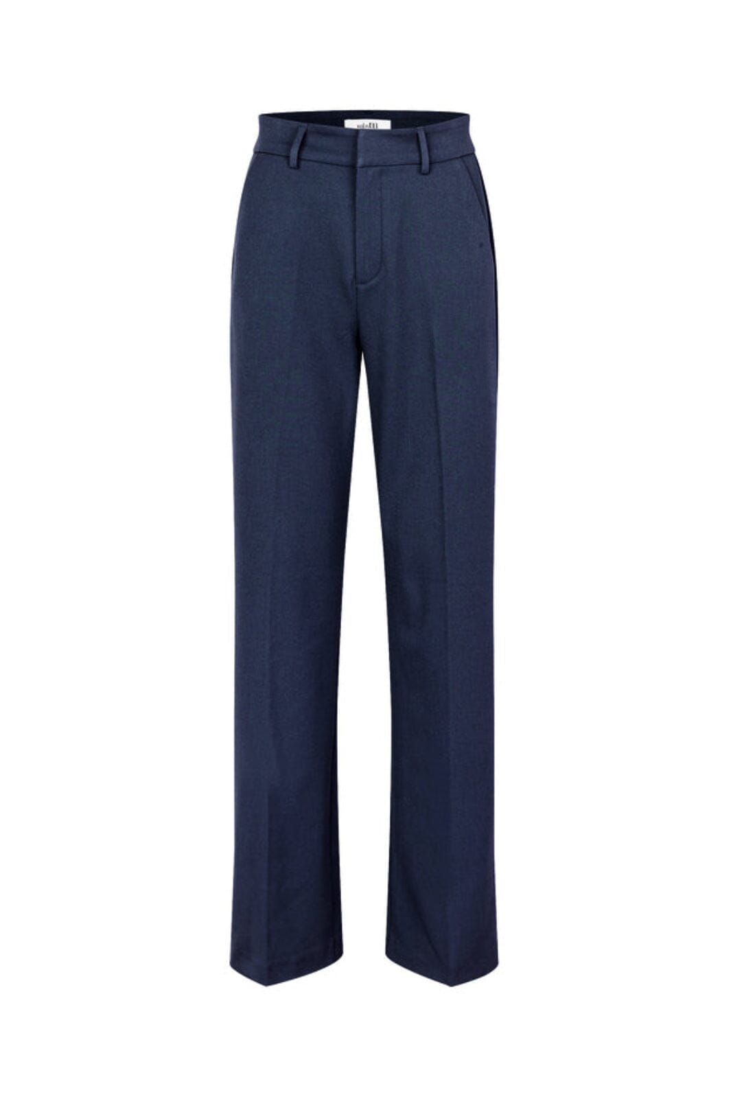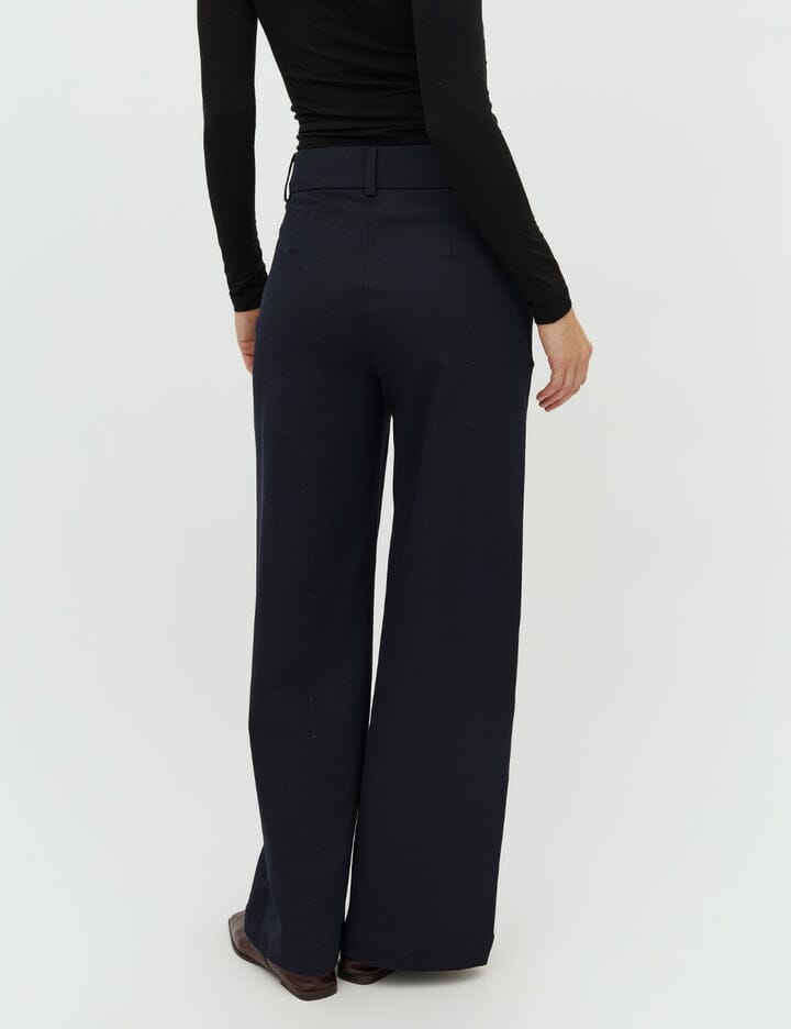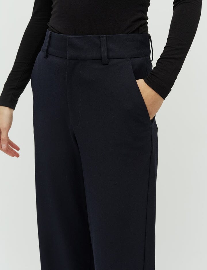 Mørkeblå bukser fra MbyM med løs pasform og brede ben. Bukserne har gulvlængde og en regulær taljehøjde med bæltestropper.