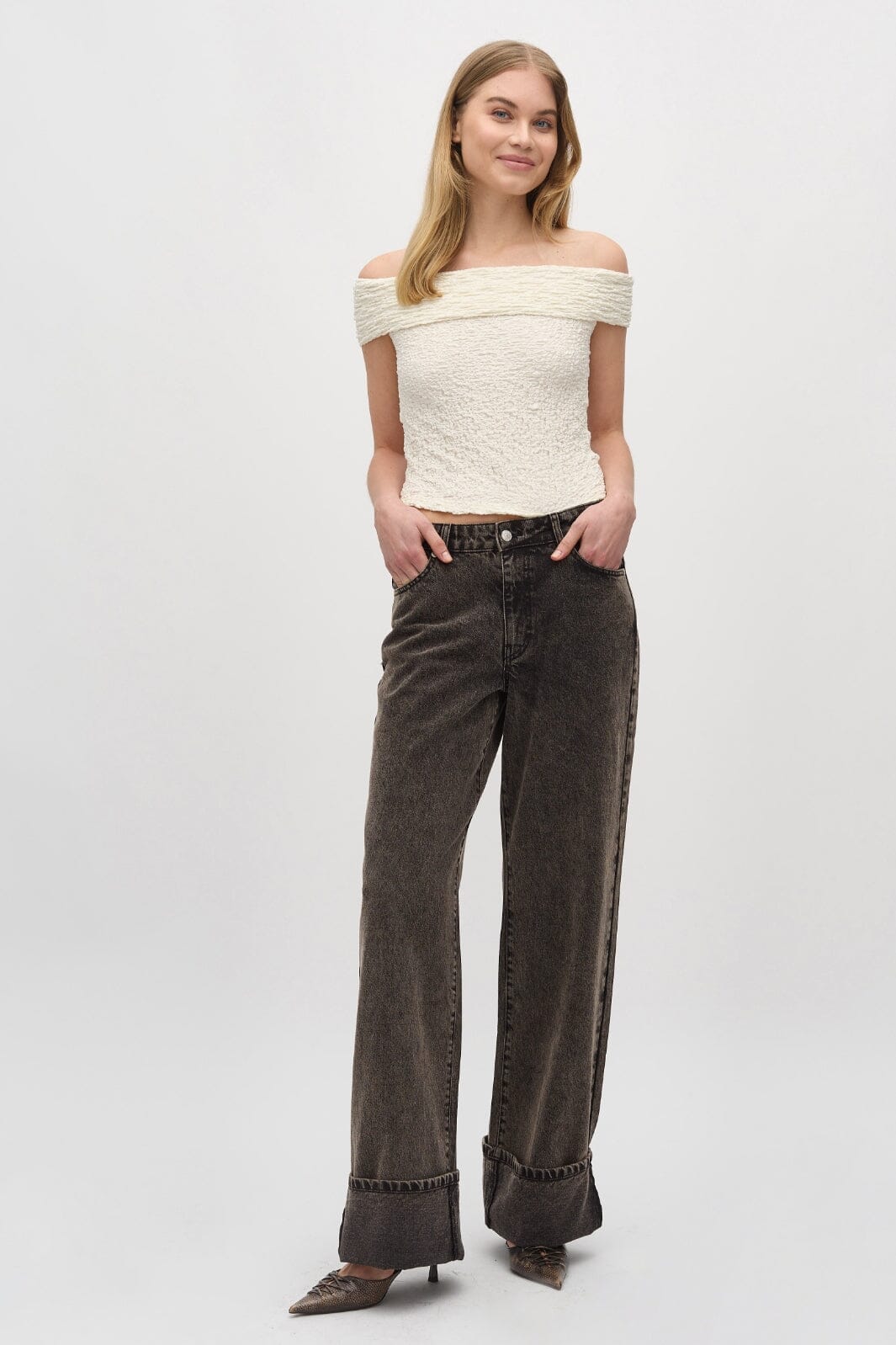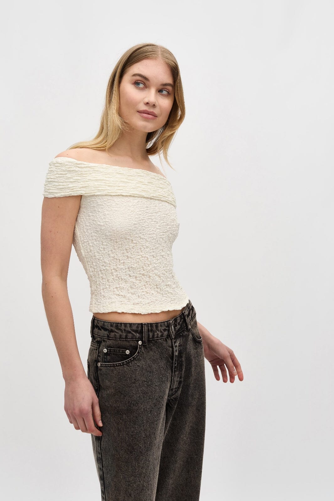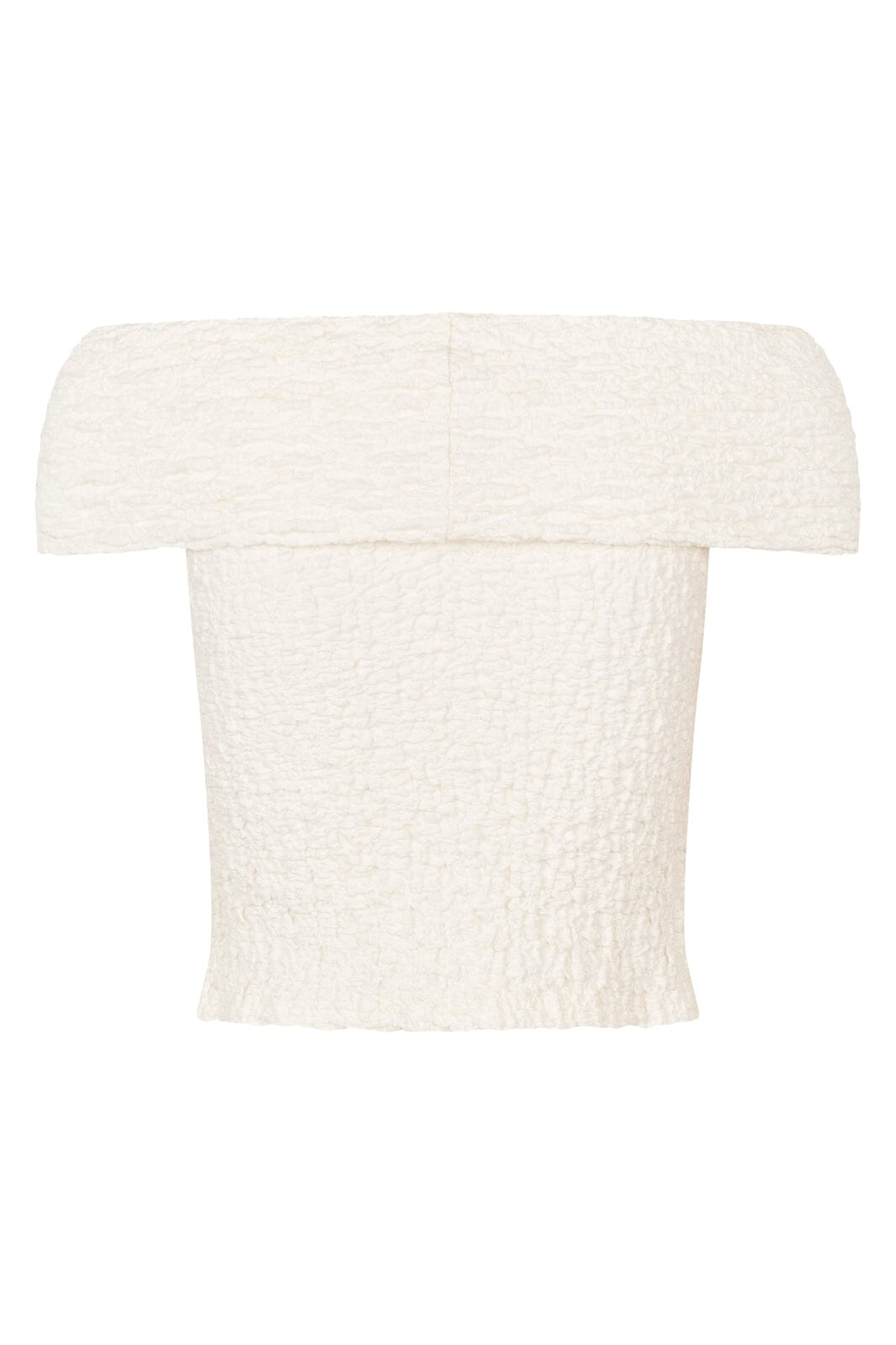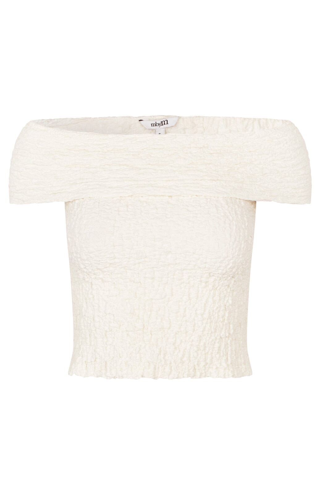 Off-shoulder top fra MbyM i en lys sukkerfarve. Toppen har en struktureret overflade og flæsedetaljer, der giver den et særpræg. Fremstillet i en blanding af bomuld, nylon og elasthan.