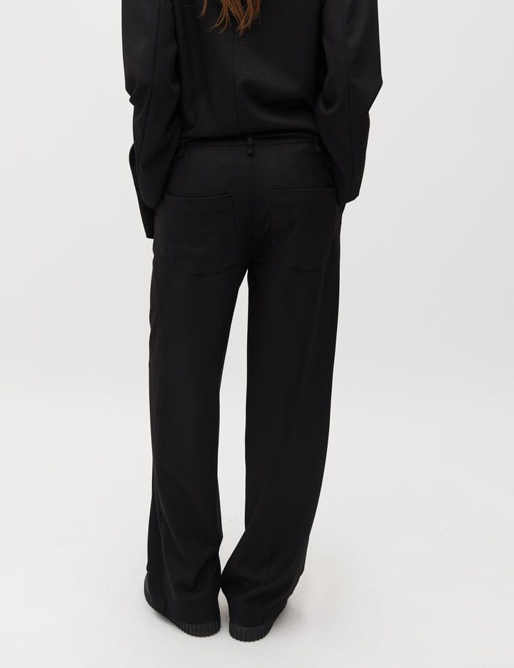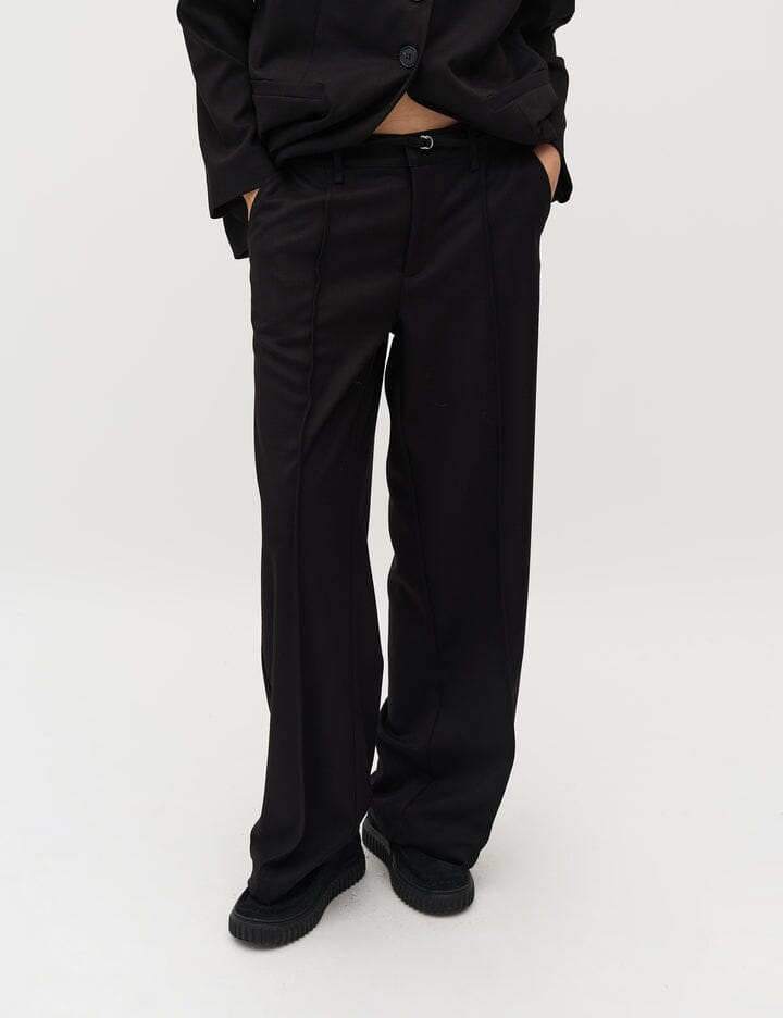 Sorte bukser fra MbyM med dekorative syninger og bælte-detaljer. Bukserne har en bred benåbning og gulvlængde, og de passer til både afslappede og formelle lejligheder.