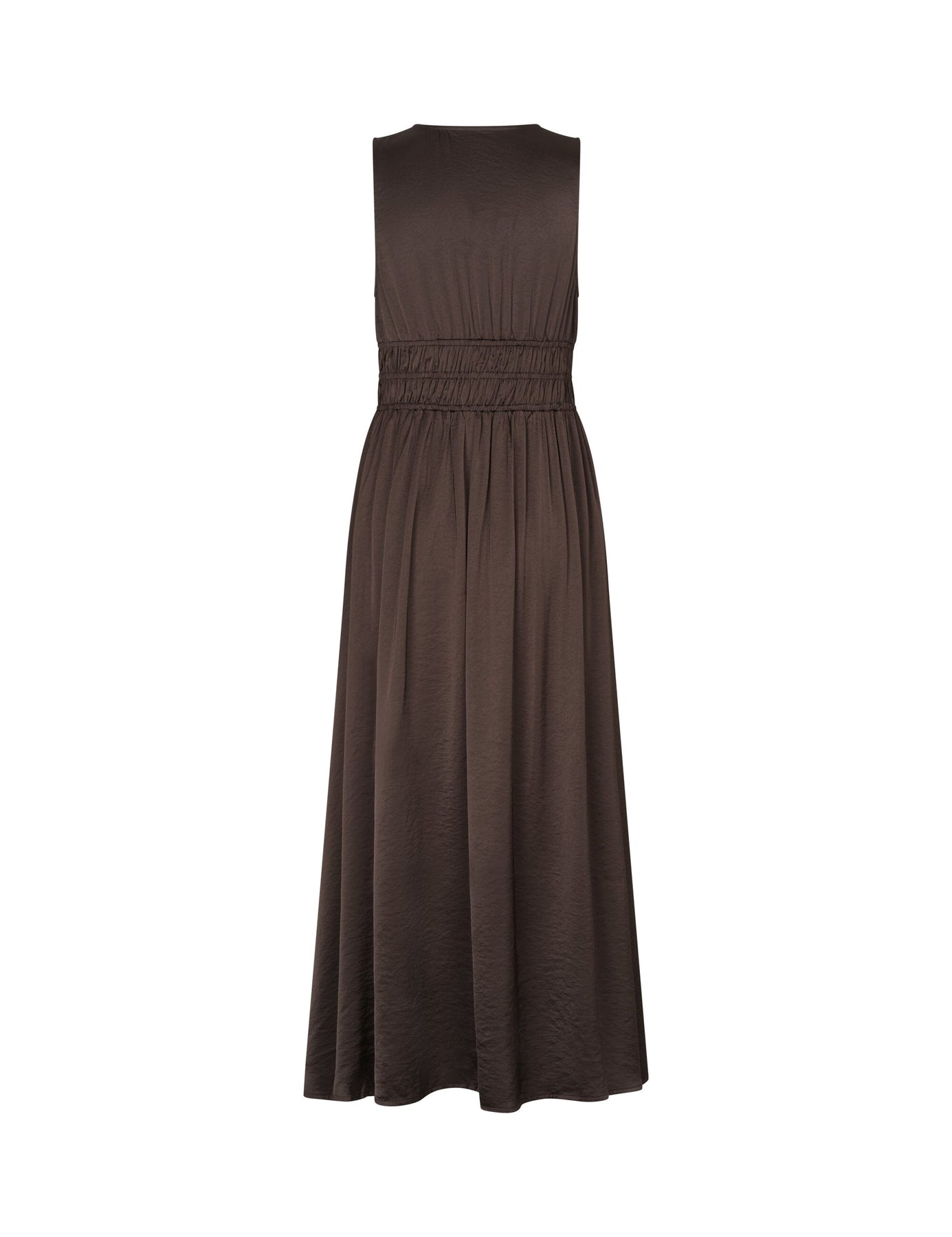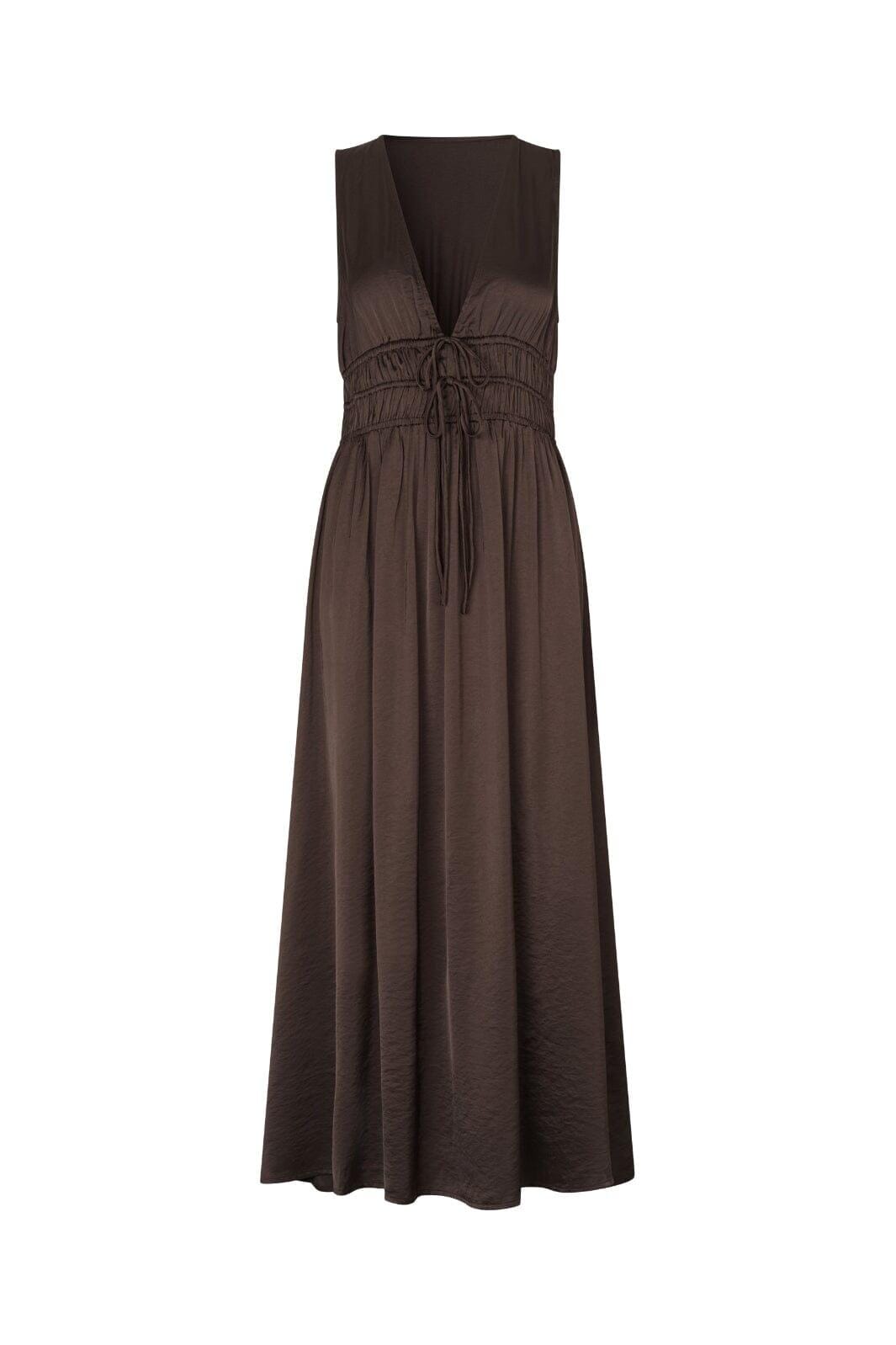 Brun kjole fra MbyM i farven Java. Kjolen er ærmeløs med en V-udskæring og går til midt på læggen.