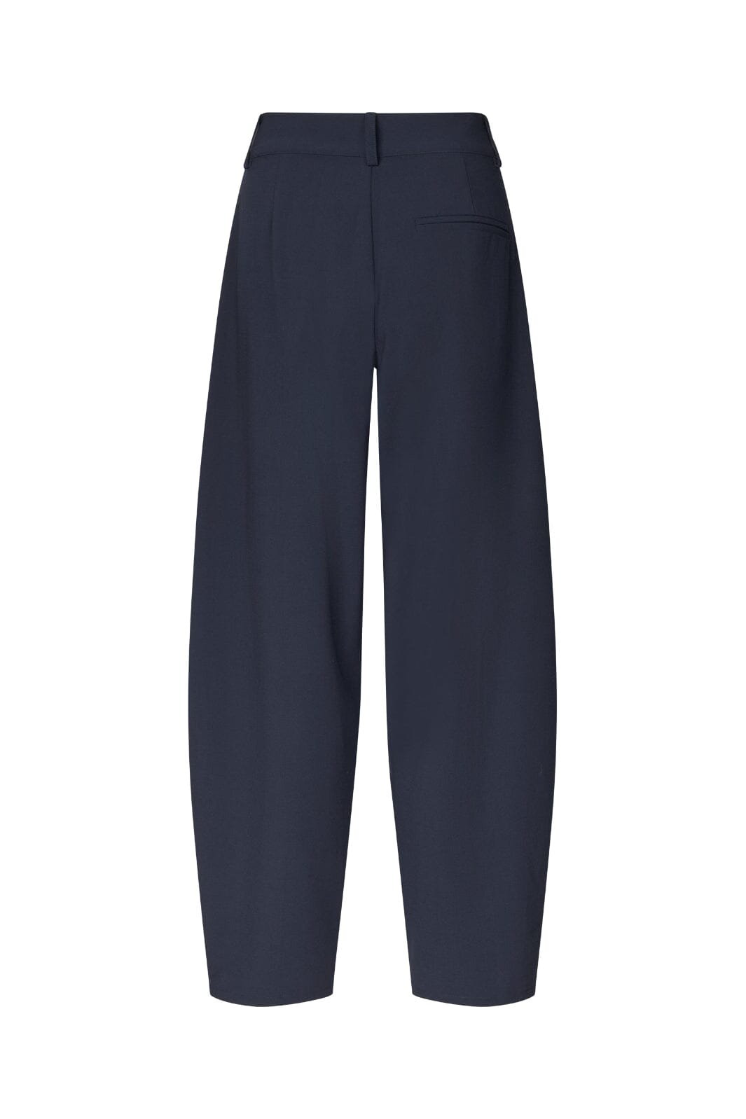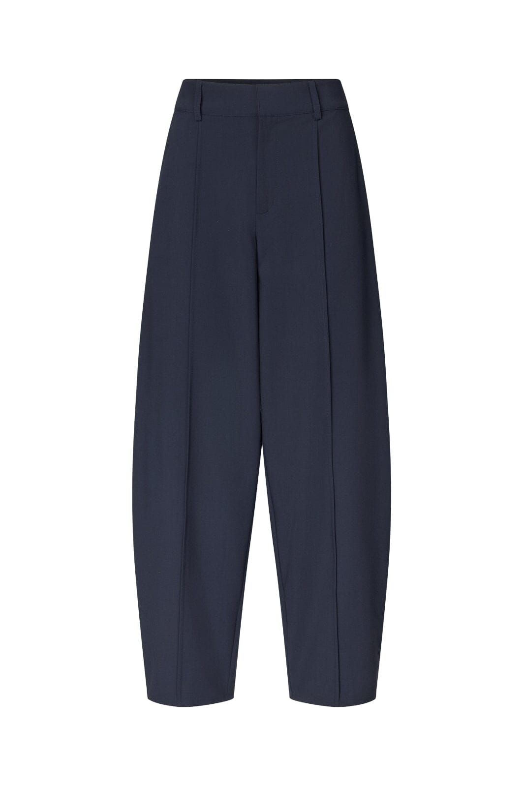 Mørkeblå bukser fra MbyM med højtaljet design og bred benform. Bukserne har en løs pasform og går til midt på læggen.
