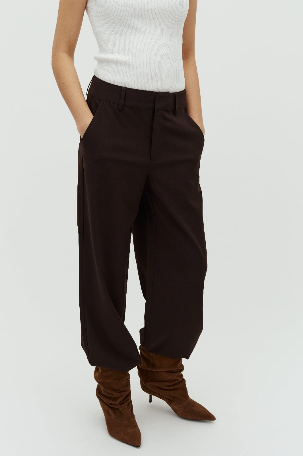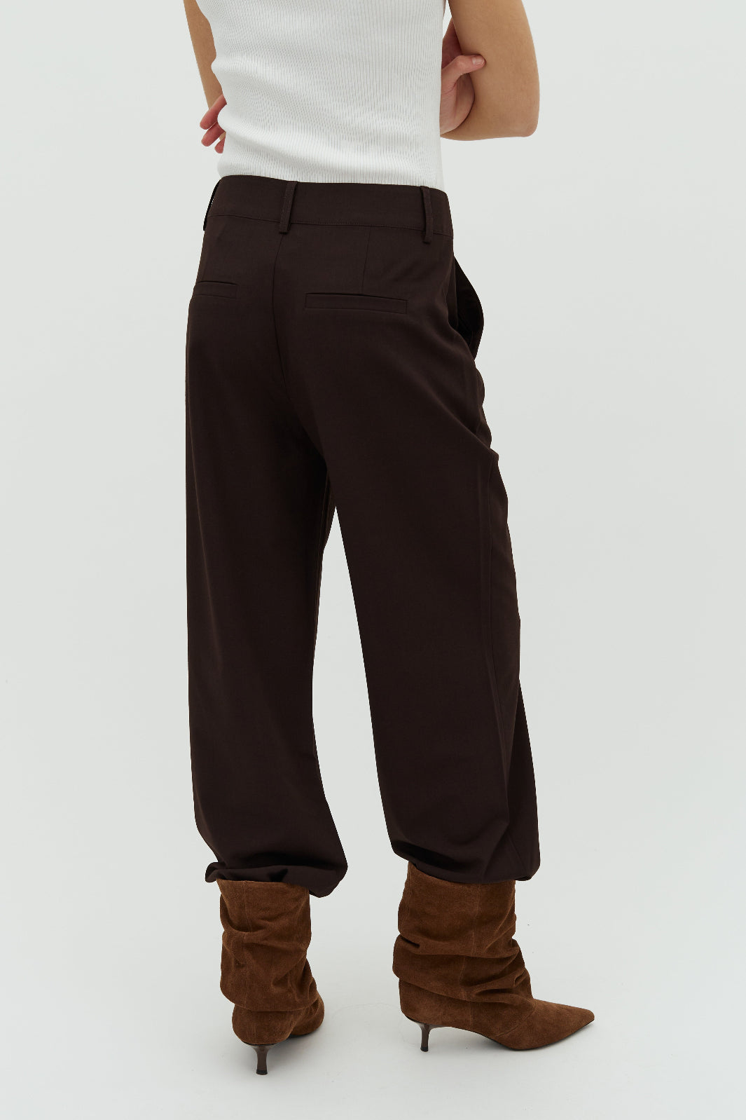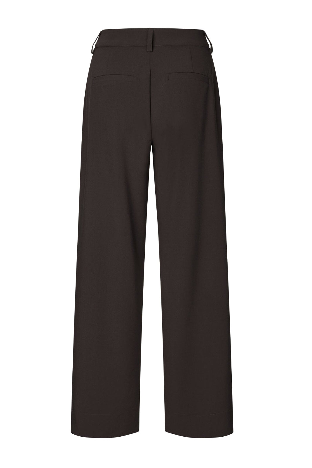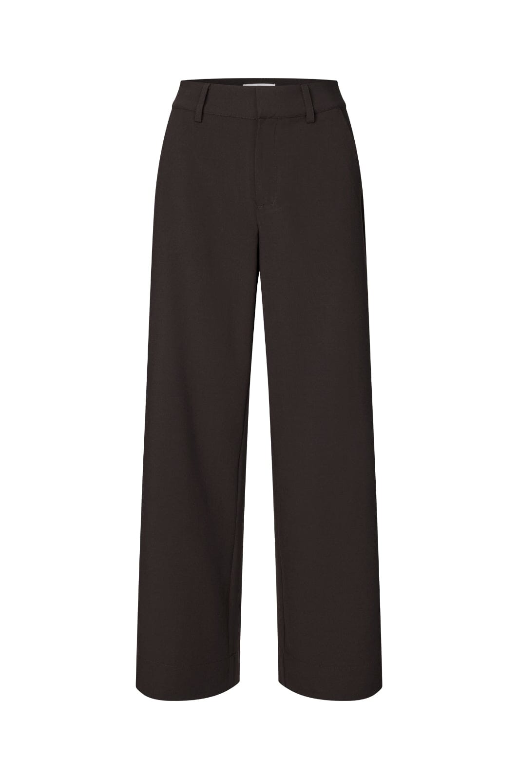 Mørkebrune bukser fra MbyM med lige ben, bæltestropper og sidelommer. Bukserne har en løs pasform og en gulvlængde.