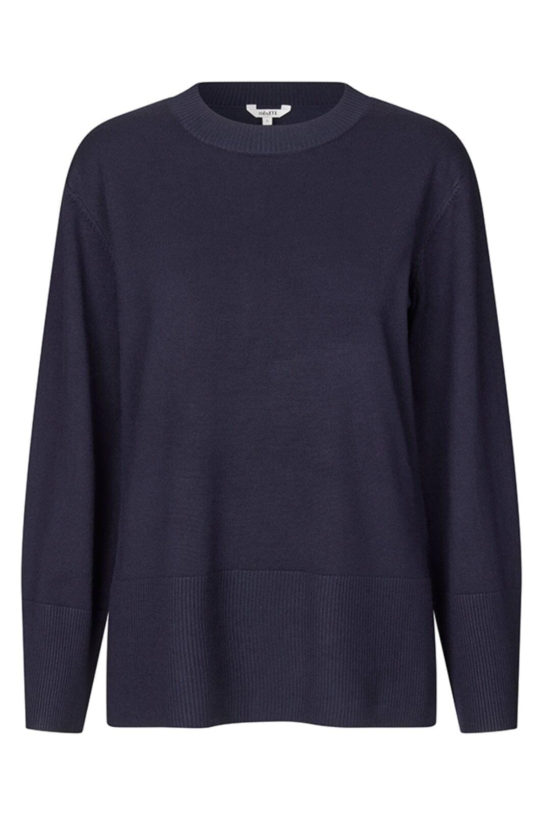 Strikbluse fra MbyM i en mørkeblå Night Sky-farve. Den har en rund hals og lange ærmer med ribkant i bunden, der giver en god pasform.