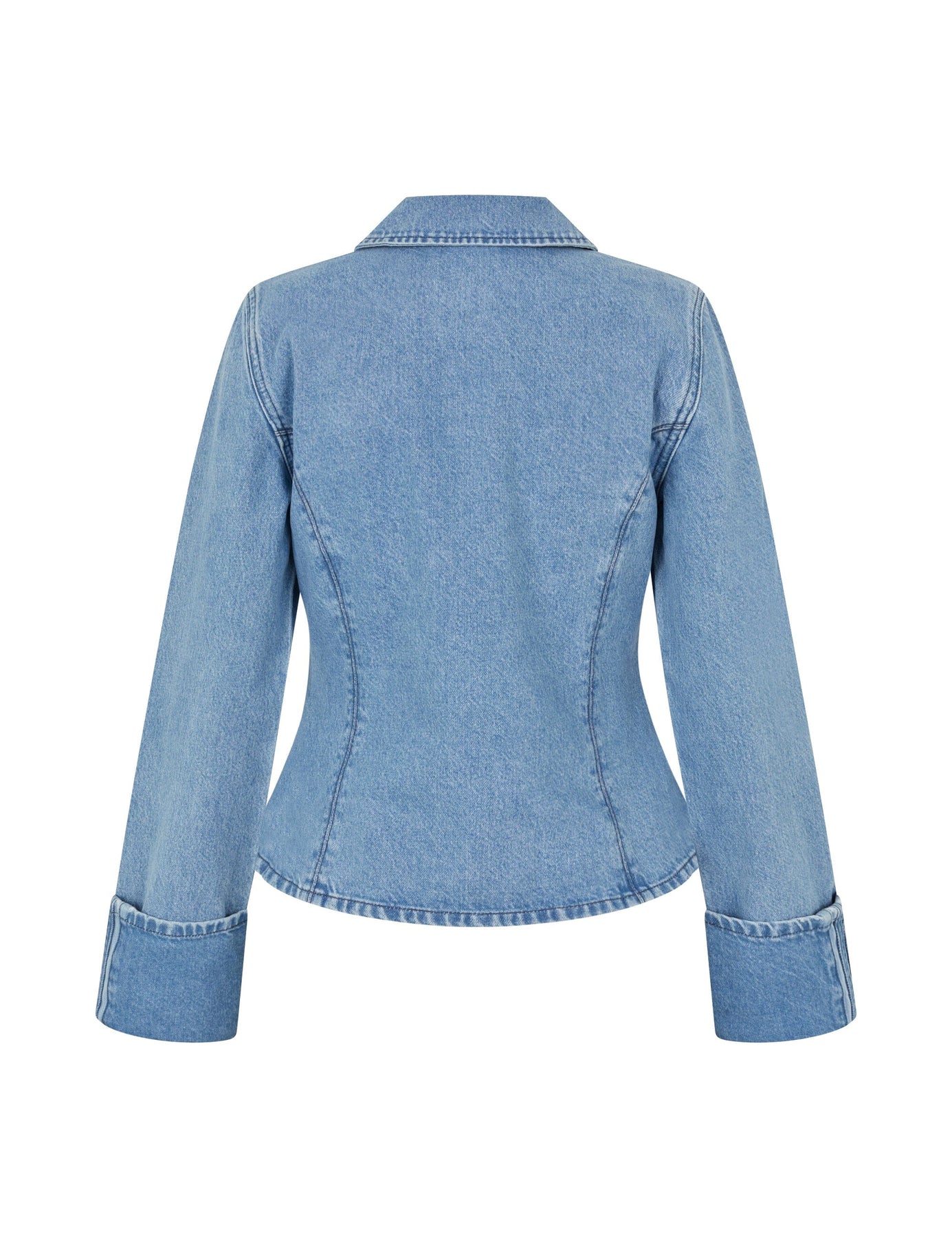 Denimjakke fra MbyM i en lys blå vask. Jakken har en slim fit-pasform med skjortekrave og knapper hele vejen ned. De dekorative syninger giver jakken et gennemført udtryk.