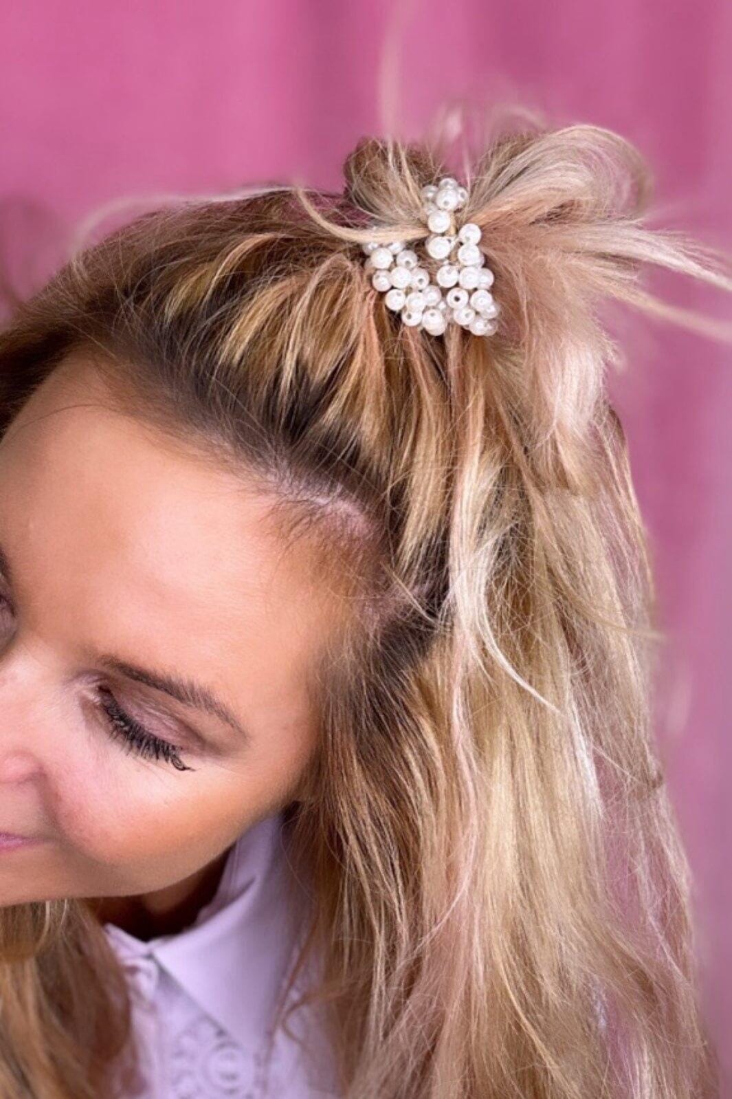 Denne hårelastik prydes af fine perler, der tilføjer et strejf af glamour til din hverdagsfrisure eller en sofistikeret opsætning til aftenbrug.
