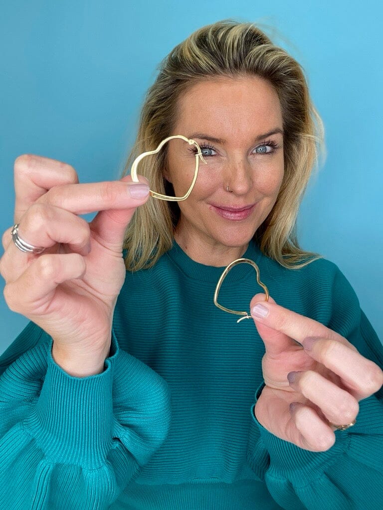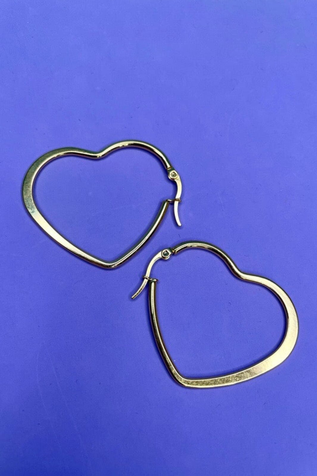 Hjerteformede øreringe fra Mellow Moon i forgyldt messing. Smykkerne er nikkel- og blyfri, hvilket gør dem velegnede til sensitiv hud.