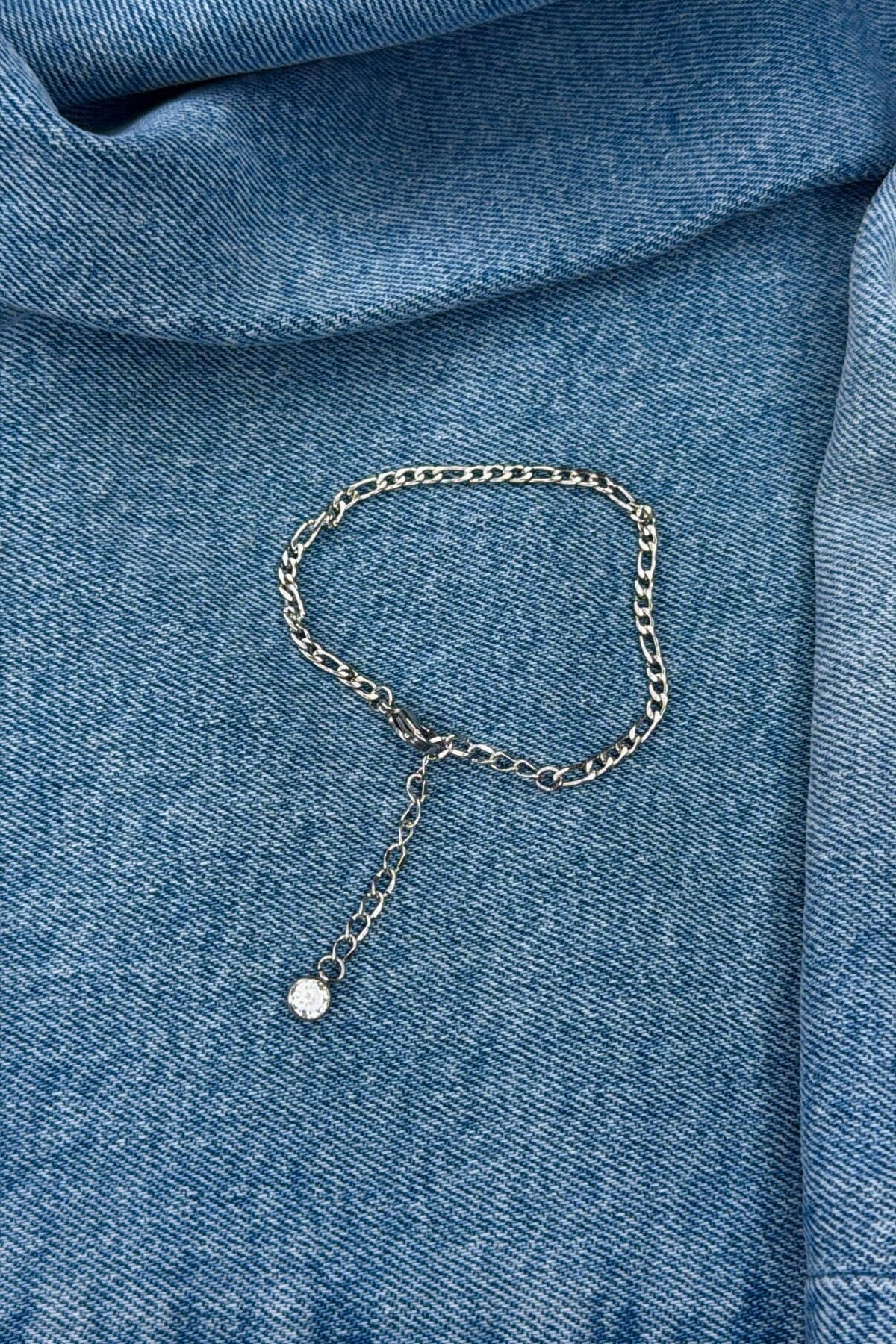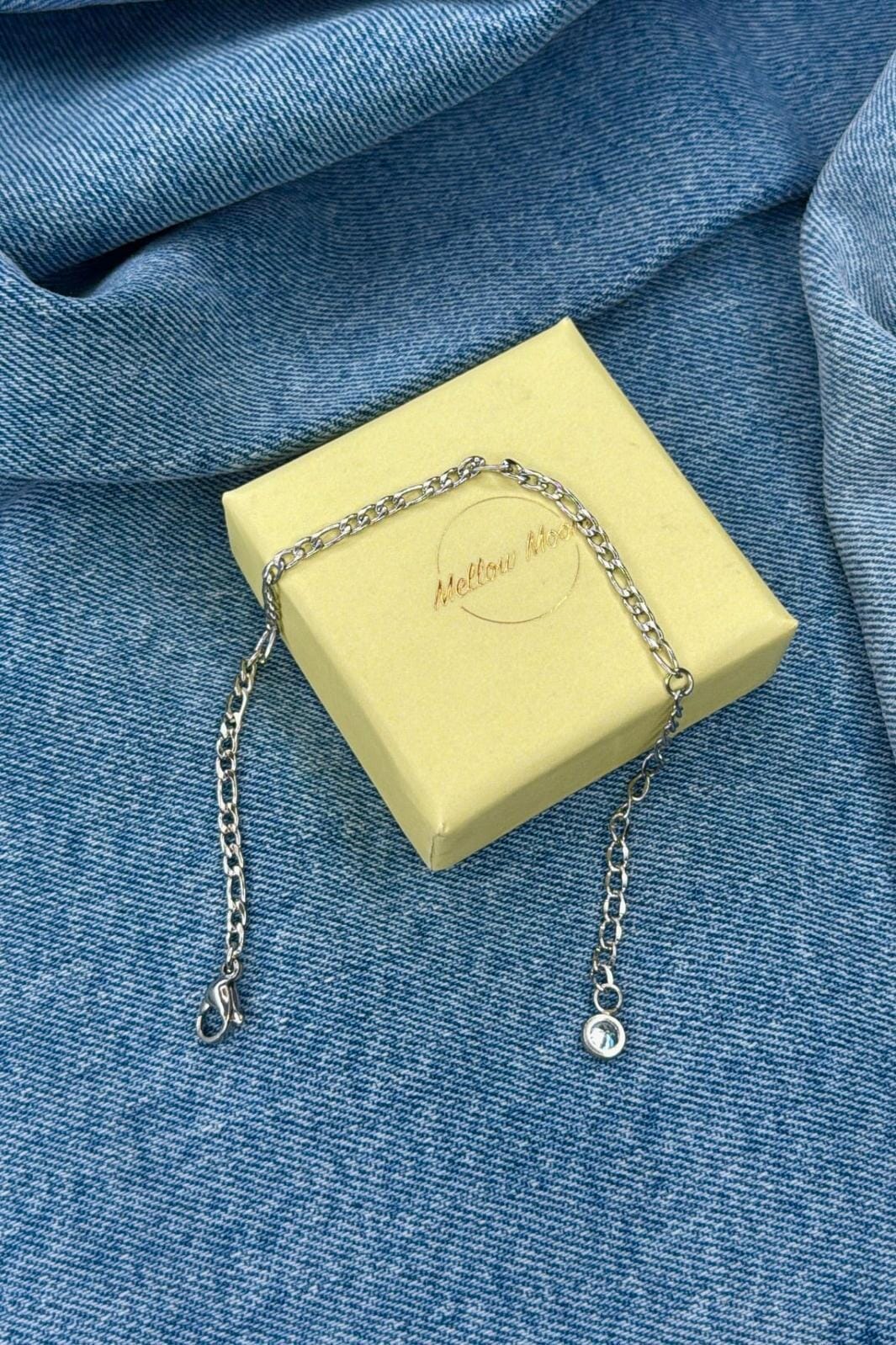 Sølvfarvet armbånd fra Mellow Moon med en klar sten som vedhæng. Armbåndet har en forsølvet overflade og kommer i en gul gaveæske.