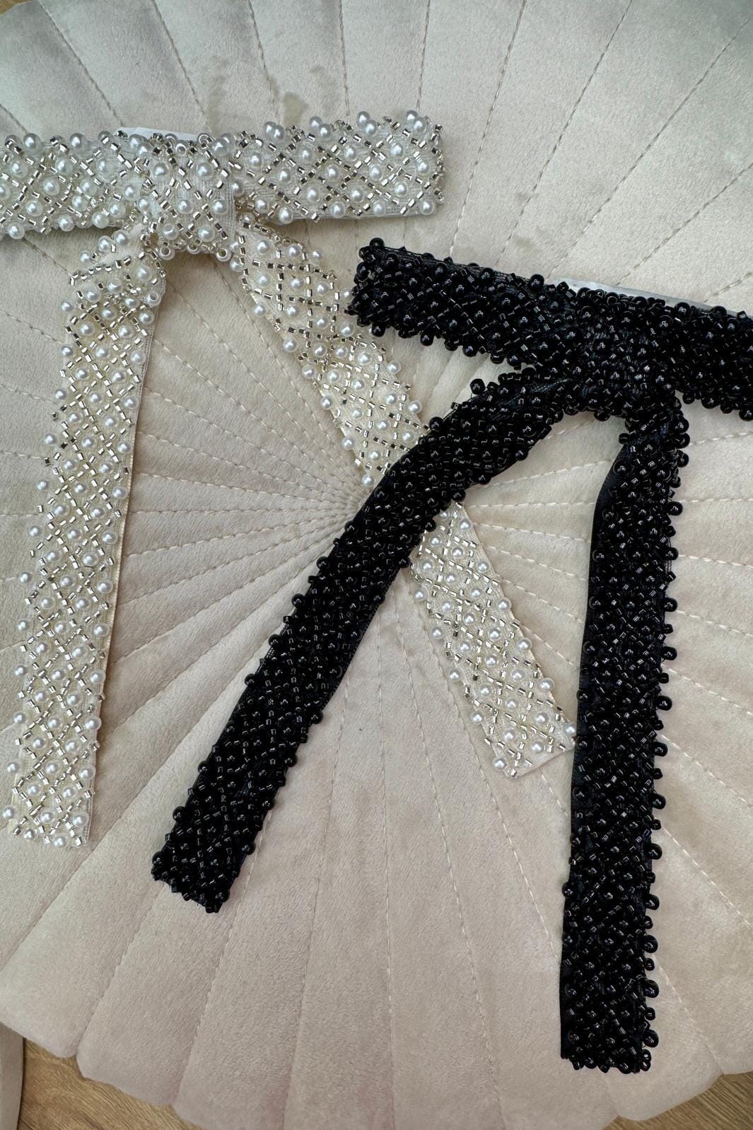 Hvid sløjfe fra Mellow Moon med perleudsmykning og krydsmønster. Sløjfen har et detaljeret design med små perler, der danner et gennemgående mønster på hele overfladen.