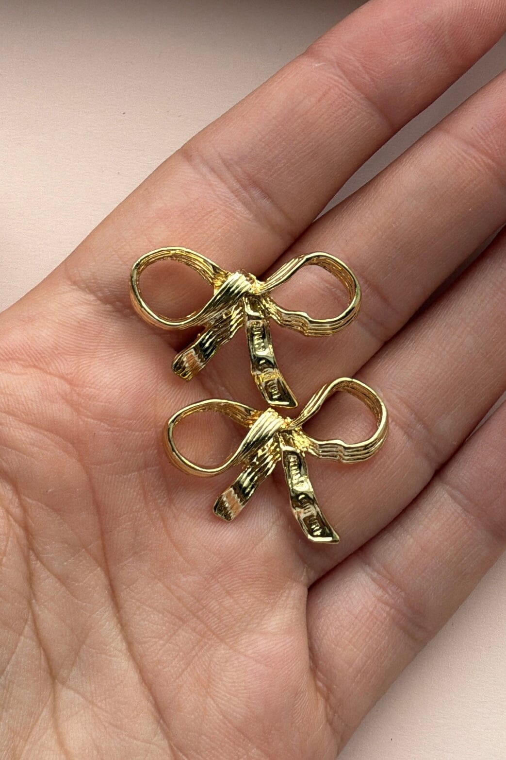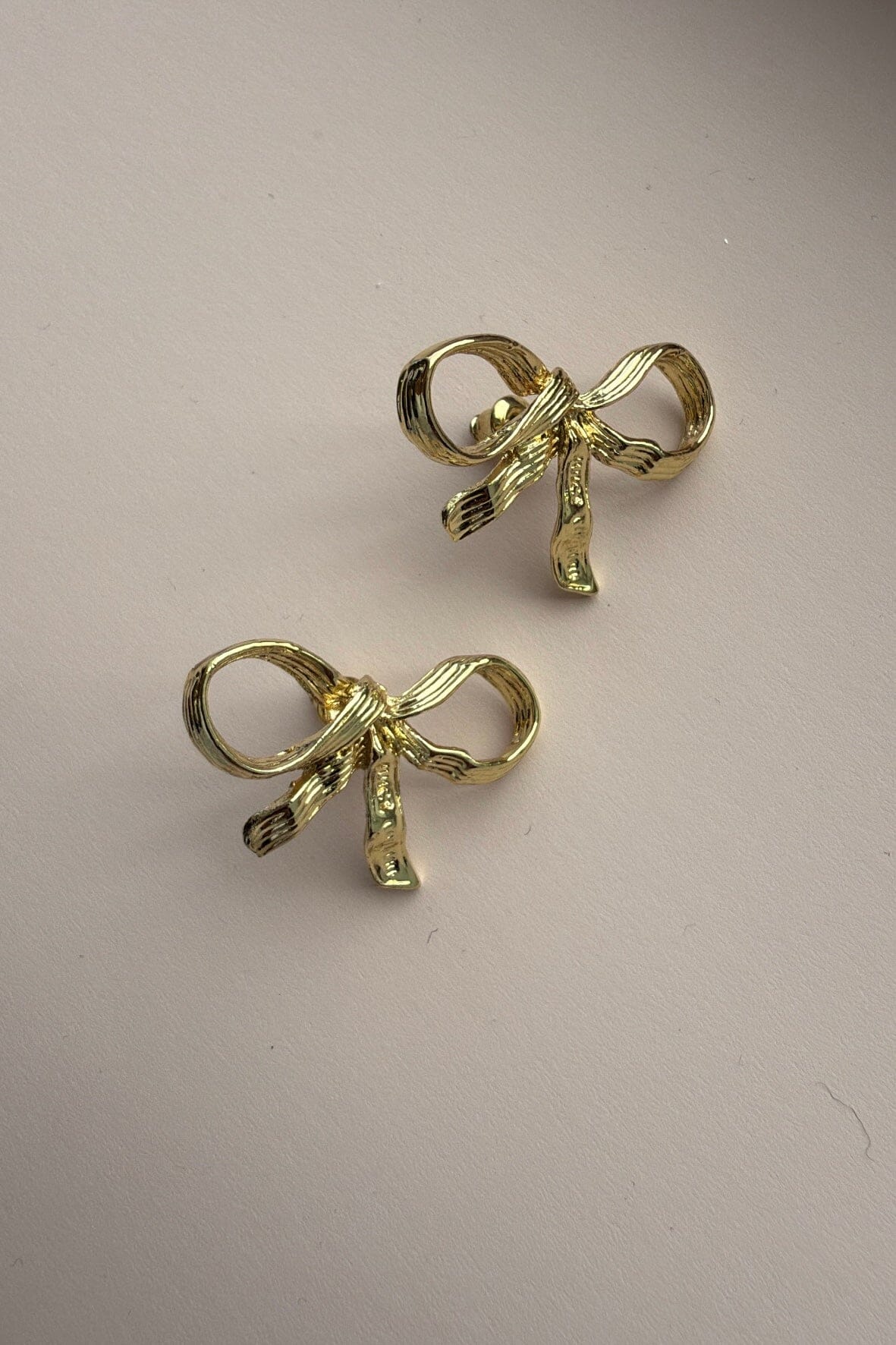 Sløjfeformede øreringe fra Mellow Moon med en gylden overflade. De små sløjfer har en detaljeret tekstur og en fin udformning, der kan bruges til både hverdag og fest.
