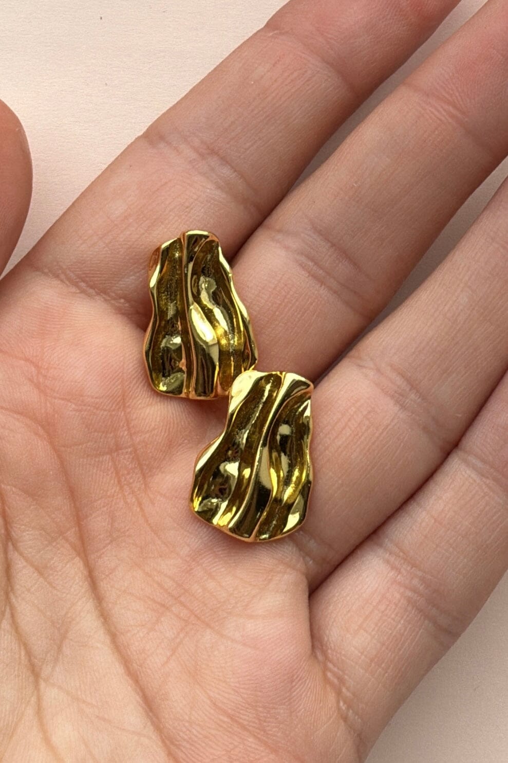 Forgyldte øreringe fra Mellow Moon med en bølget overflade. Øreringene er lavet af sterling sølv med en 18 karat guldbelægning, der giver et gyldent skær til det teksturerede design.