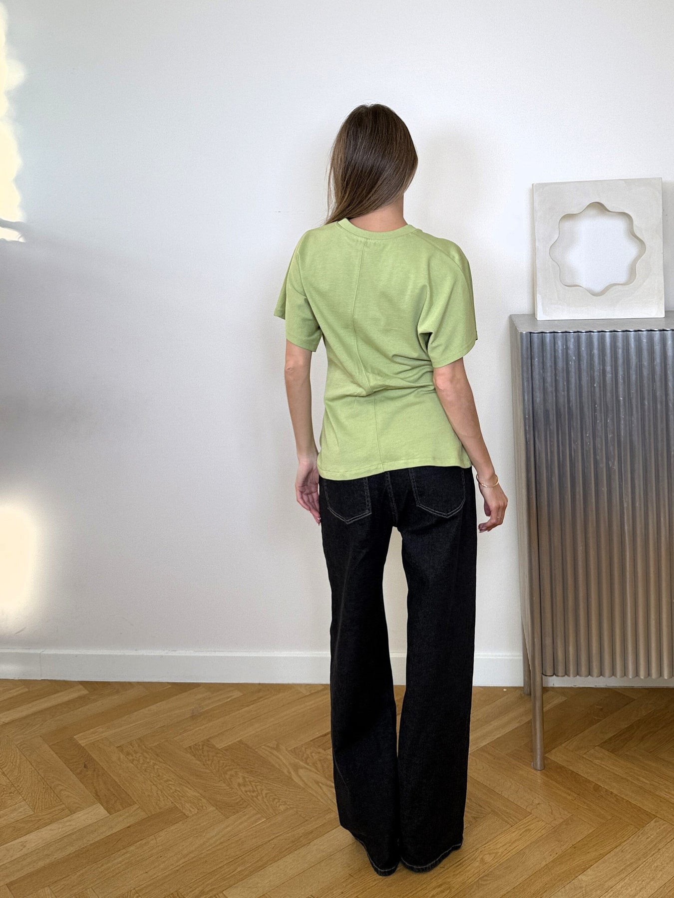Lys grøn T-shirt fra Modström med dekorative syninger og rynkedetaljer. T-shirten har en figursyet pasform og korte ærmer.