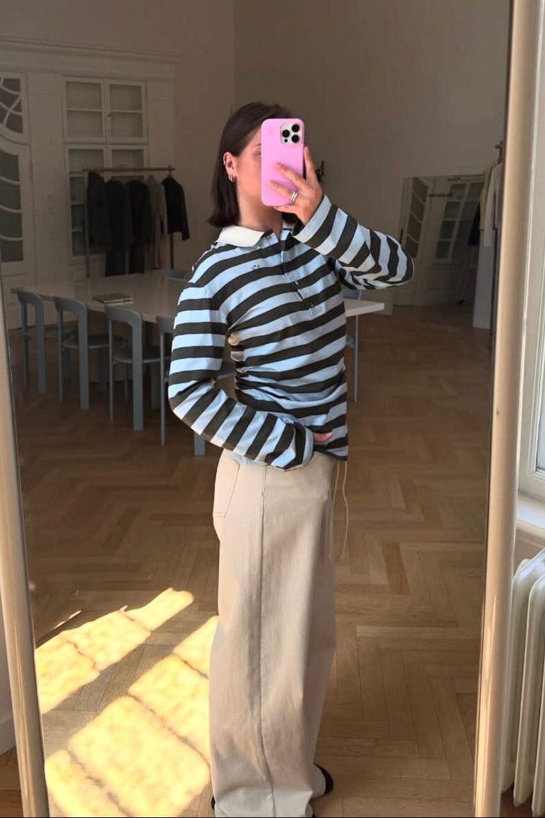 Langærmet polo fra Modström i økologisk bomuld. Designet med vandrette striber i lyseblå og mørkegrønne nuancer samt en hvid polokrave med knaplukning.