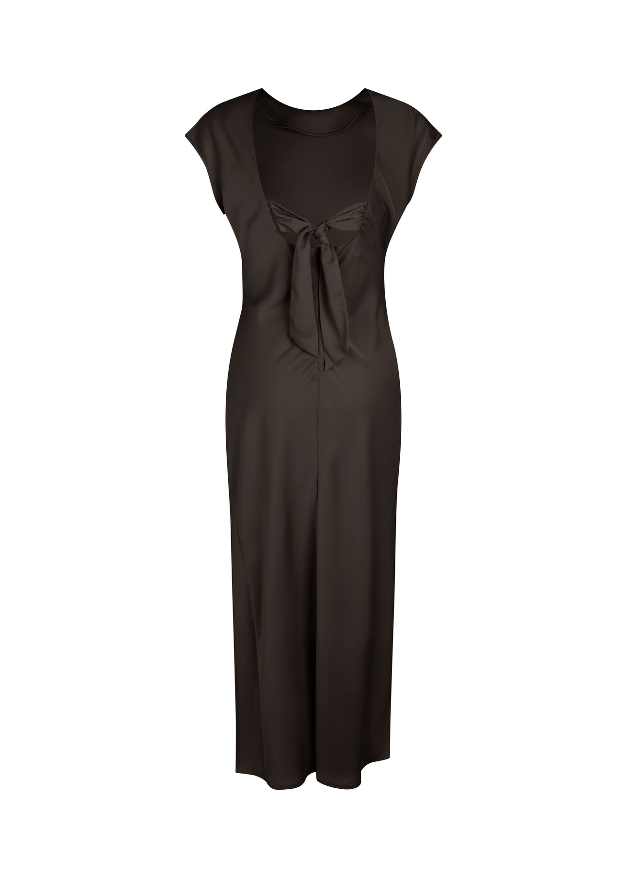Mørkebrun kjole fra Modström, lavet af genanvendt polyester med en tætsiddende pasform og en ankellang silhuet.