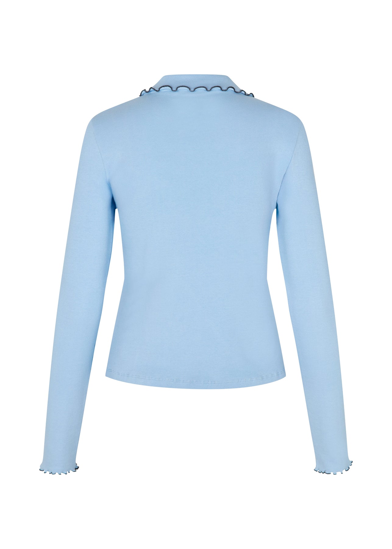 Lyseblå langærmet top fra Modström med polokrave og dekorative flæser. Toppen har slim fit-pasform og kontrastfarvet syning langs kanten.