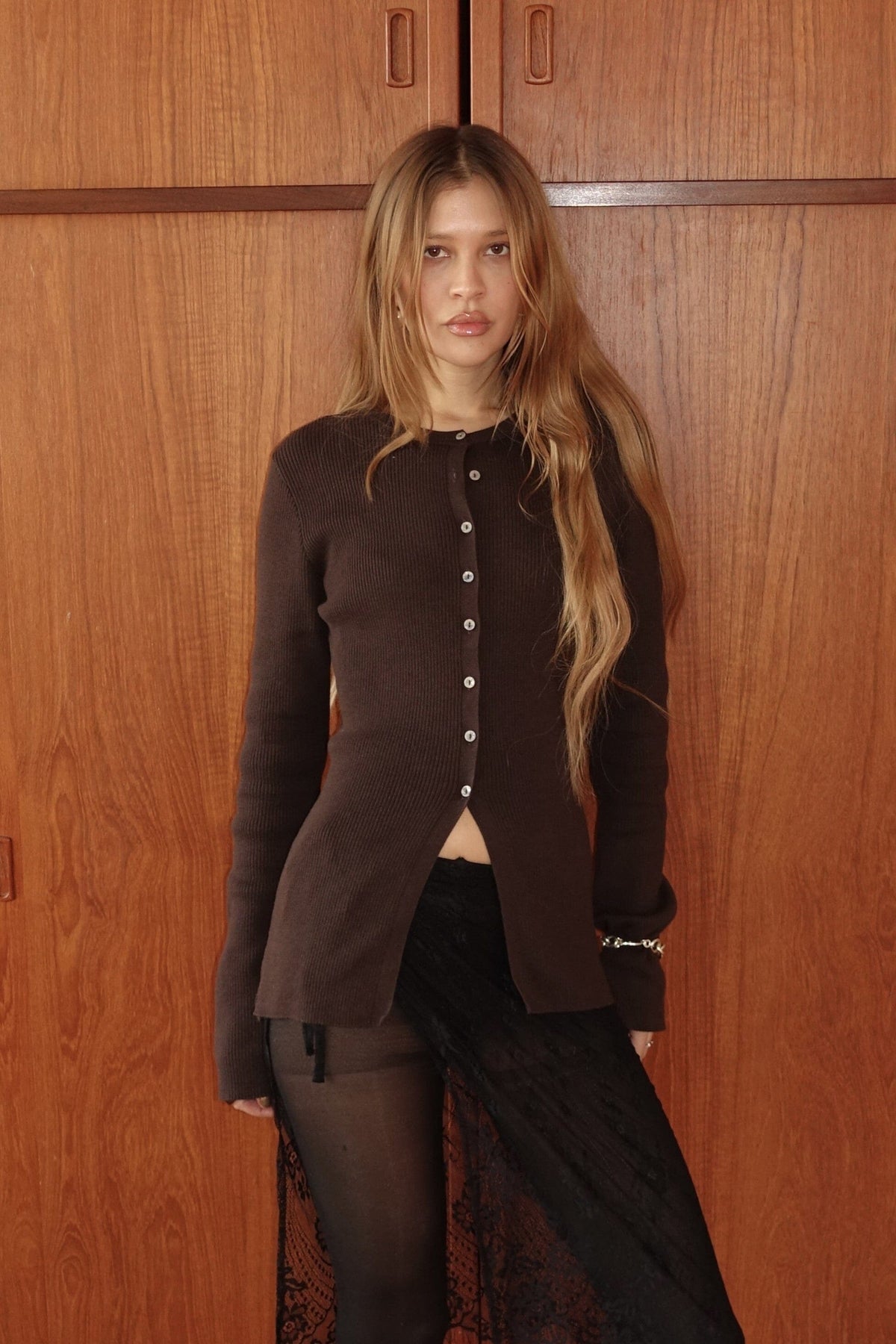Brun cardigan fra Modström med ribstrikket tekstur og en tætsiddende pasform. Cardiganen har lange ærmer og knaplukning foran.