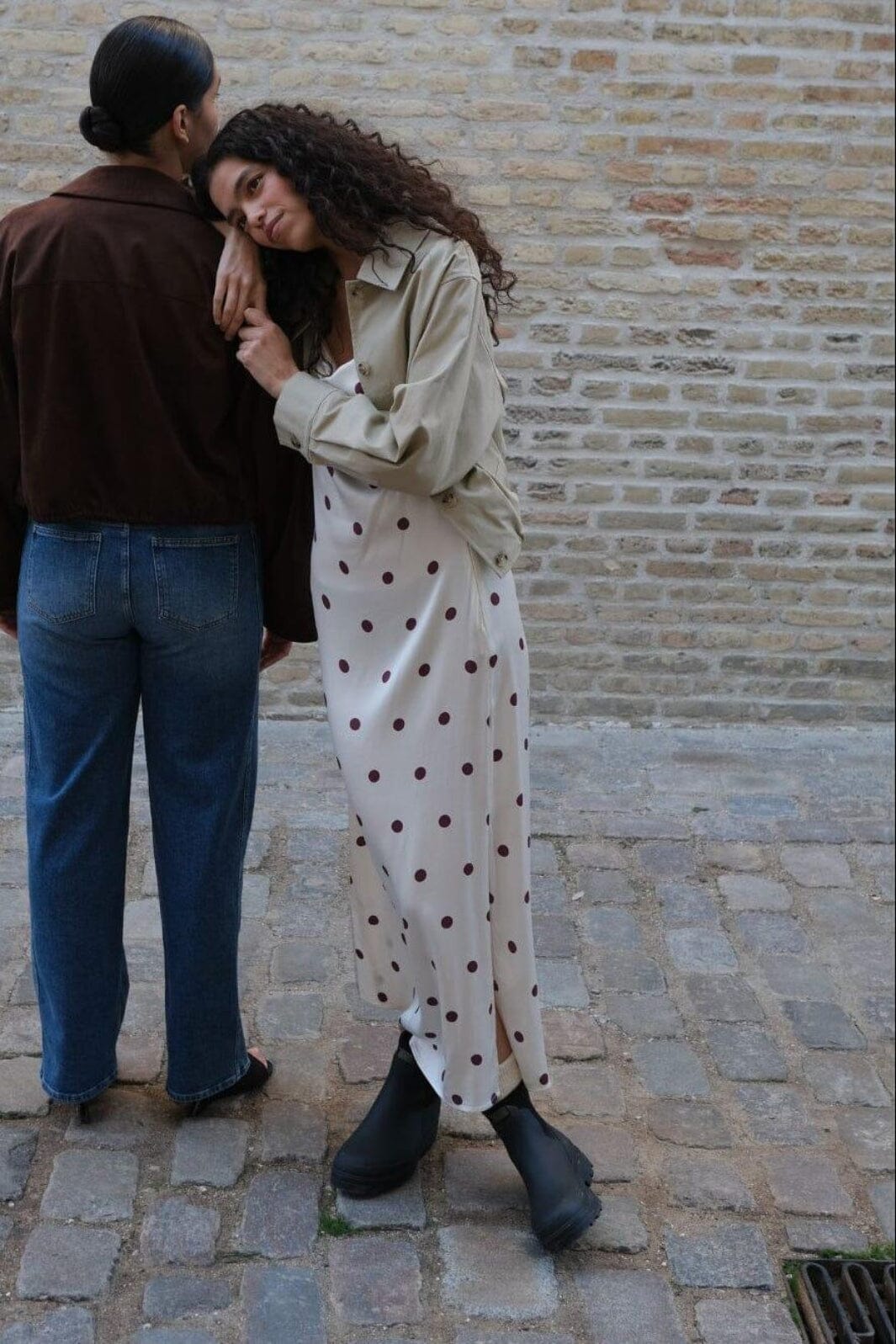 Lang kjole fra Modström, lavet af 58% Lenzing™ Ecovero™ viskose og 42% viskose med vinrøde prikker på lys baggrund.