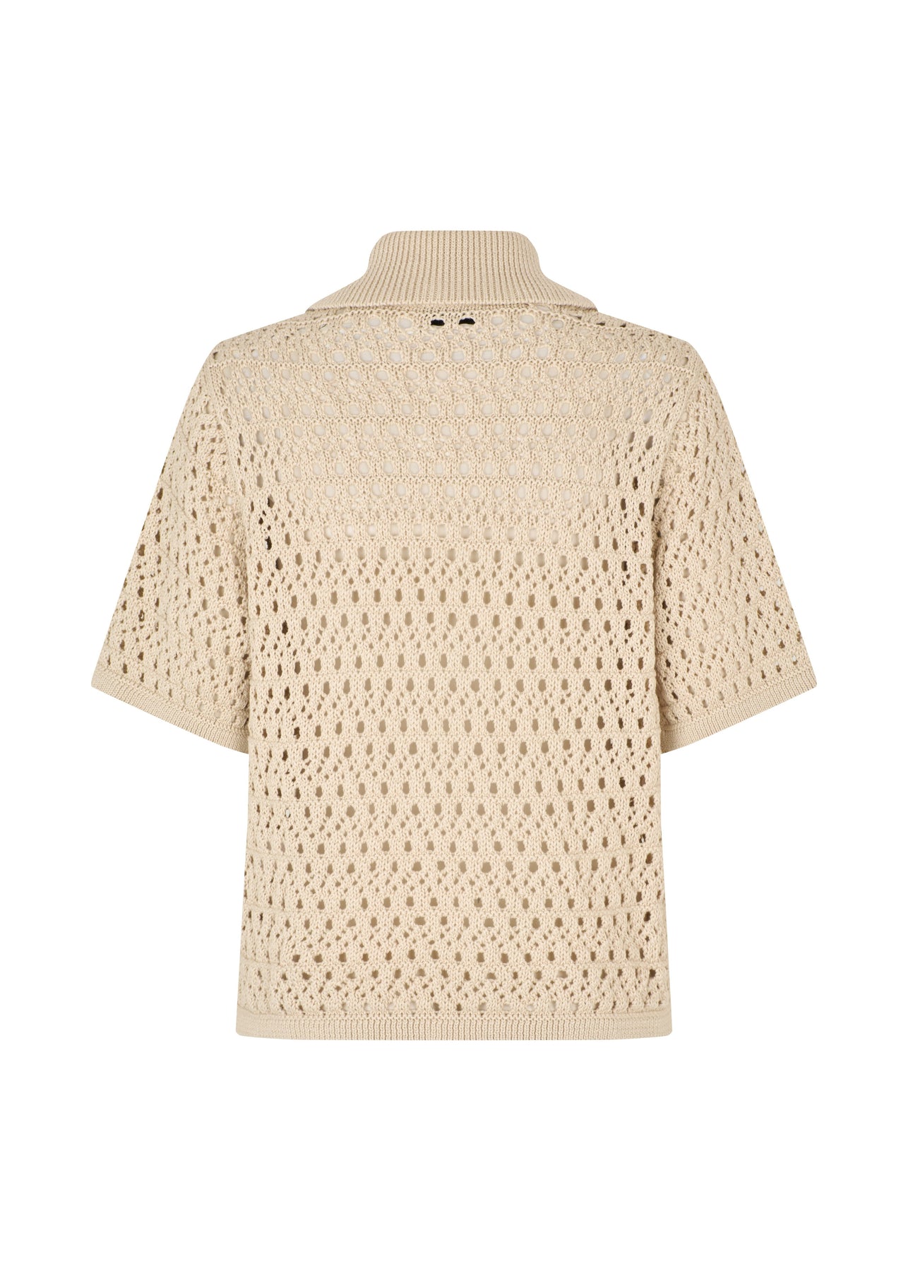 Cardigan fra Modström i en lys sandfarve. Cardiganen har et åbent strikmønster med huller og er designet med korte ærmer og en krave.