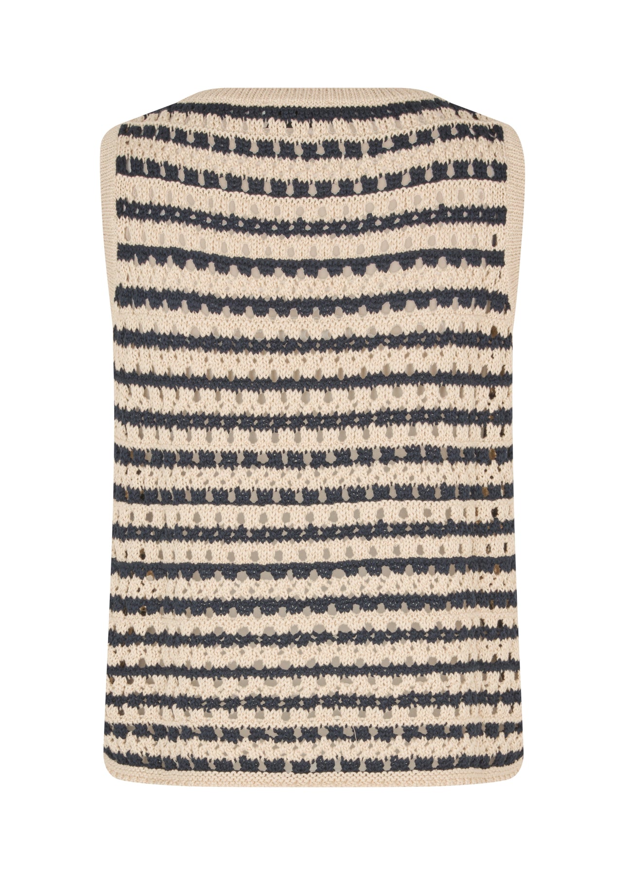 Stribet strikket top fra Modström i mørkeblå og sandfarver. Den ærmeløse top har et hulmønster og er fremstillet af 100% økologisk bomuld.