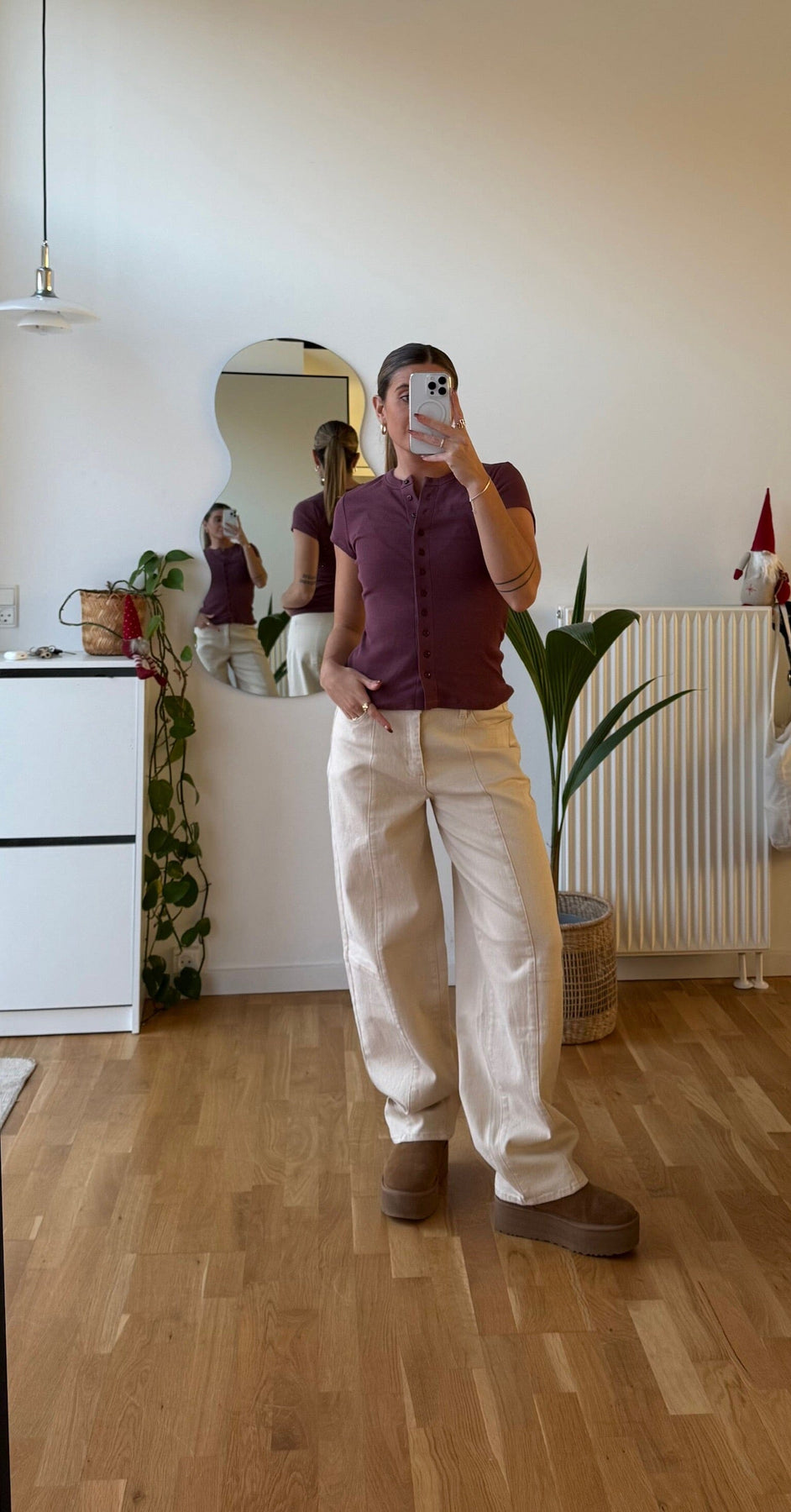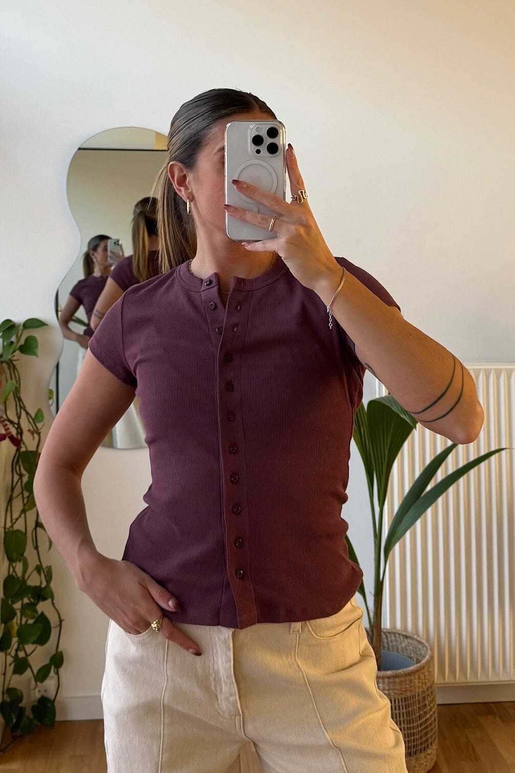 Figursyet T-shirt fra Modström i en mørk rød nuance. Den har en knaplukning foran og korte ærmer.