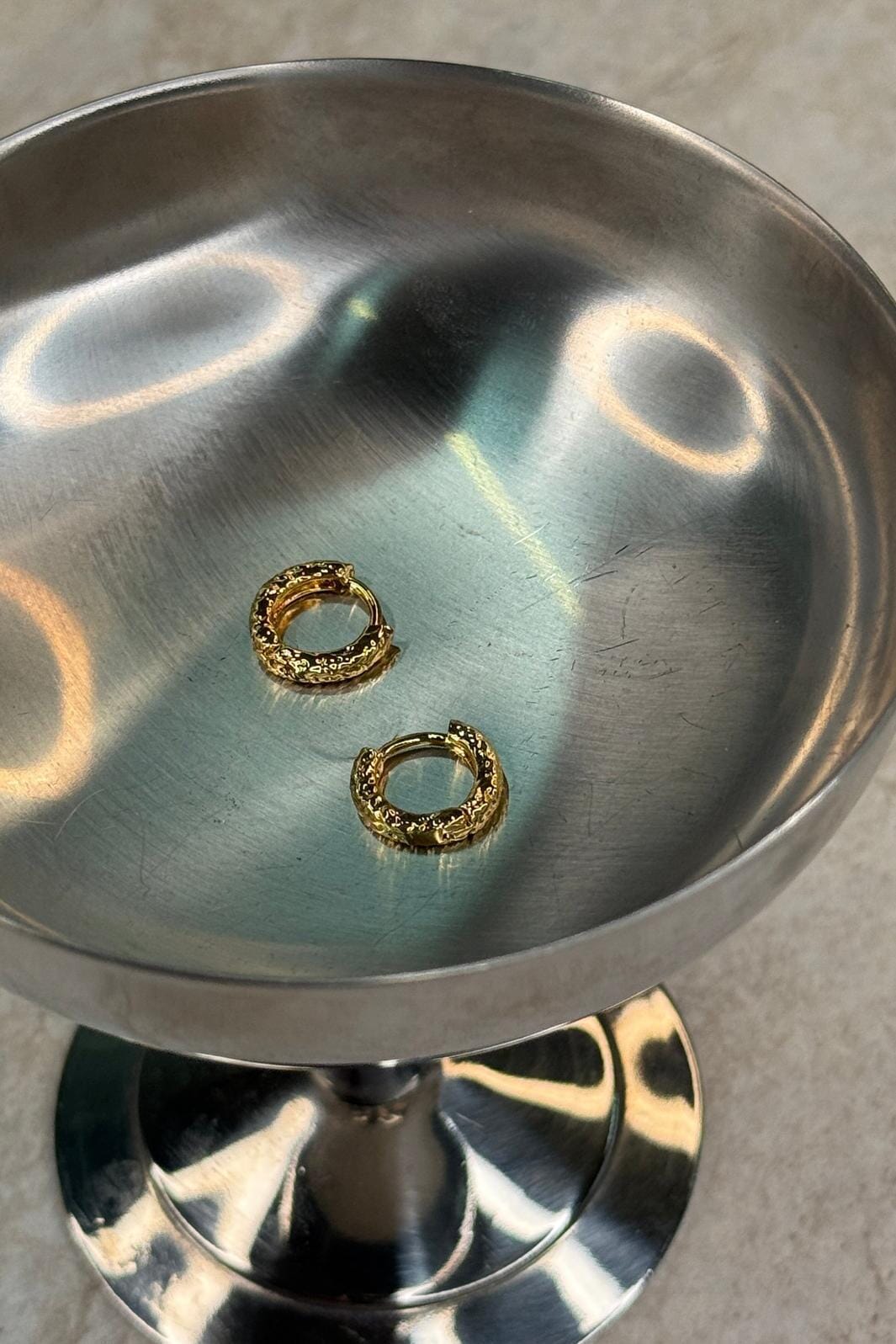 Gyldne øreringe fra Molly&My Jewellery med en cirkulær form og en detaljeret overflade. Øreringene er forgyldte og har en hængsel-lukning.