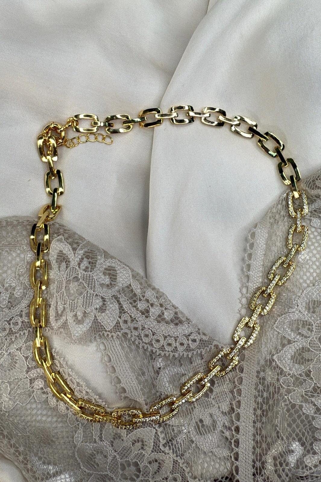 Forgyldt halskæde fra Molly&My Jewellery med rektangulære kædeled. Nogle led er dekoreret med små, skinnende sten. Kæden har en justerbar lukning.