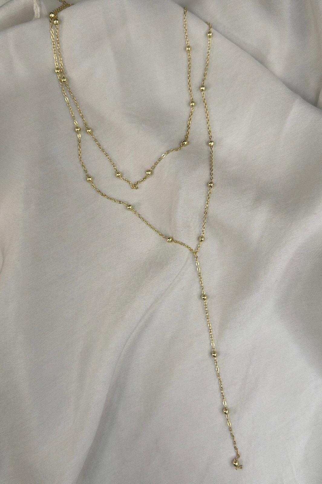 Forgyldt halskæde fra Molly&My Jewellery med små kugler fordelt langs kæden. Designet har flere lag og en Y-formet struktur.