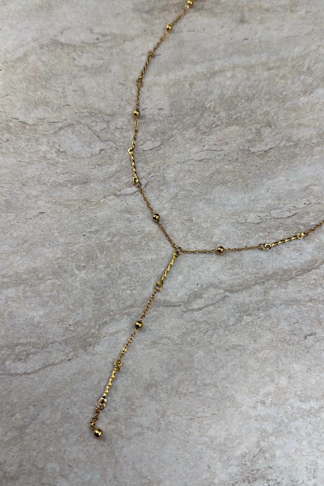 Forgyldt halskæde fra Molly&My Jewellery, lavet af rustfrit stål med små runde perler langs kæden og en Y-formet vedhængsdel.