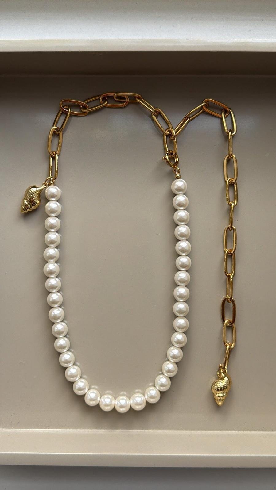 Forgyldt halskæde fra Molly&My Jewellery. Designet kombinerer hvide perler med guldfarvede kædeled i en halvt-halvt fordeling.