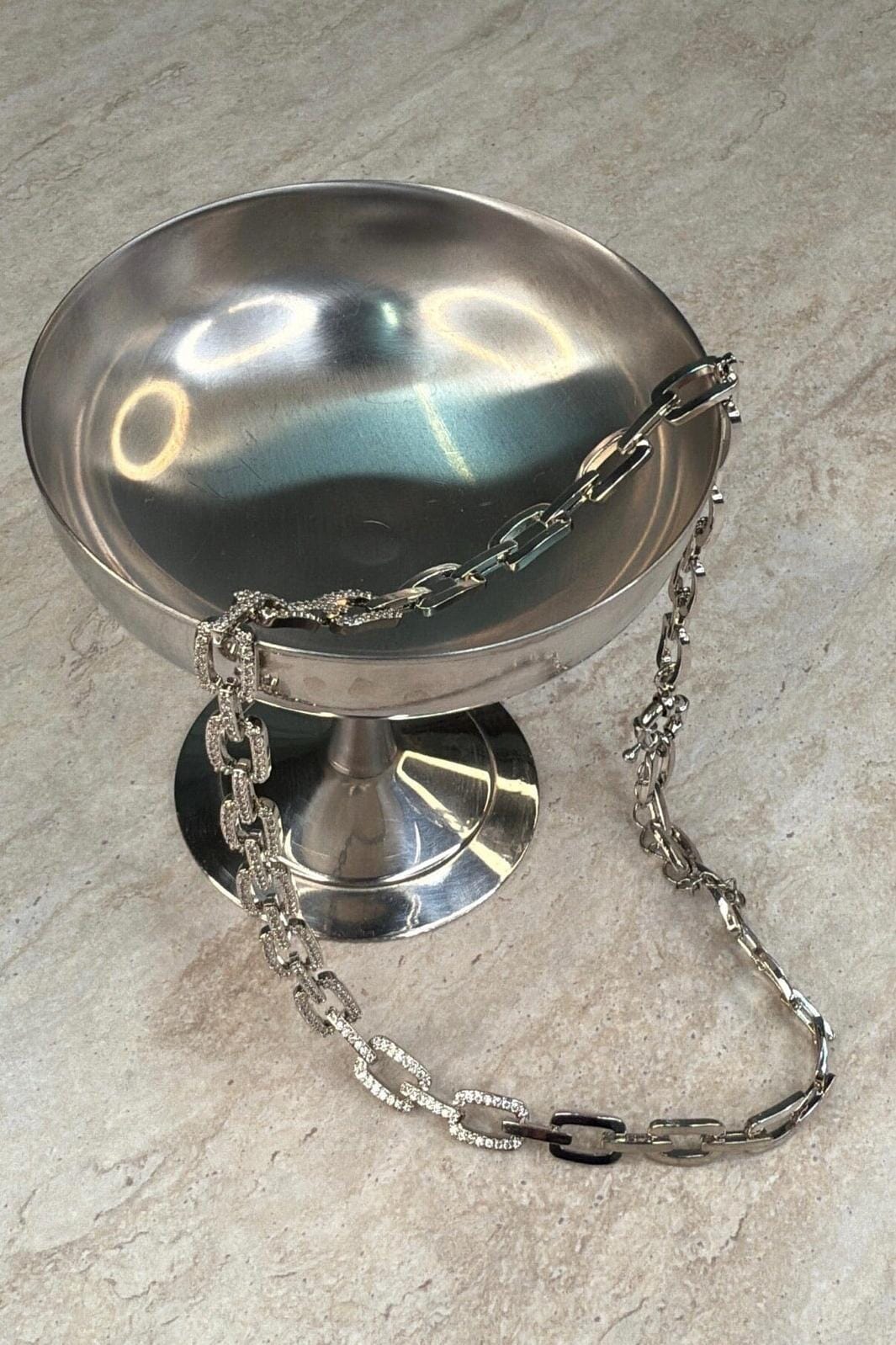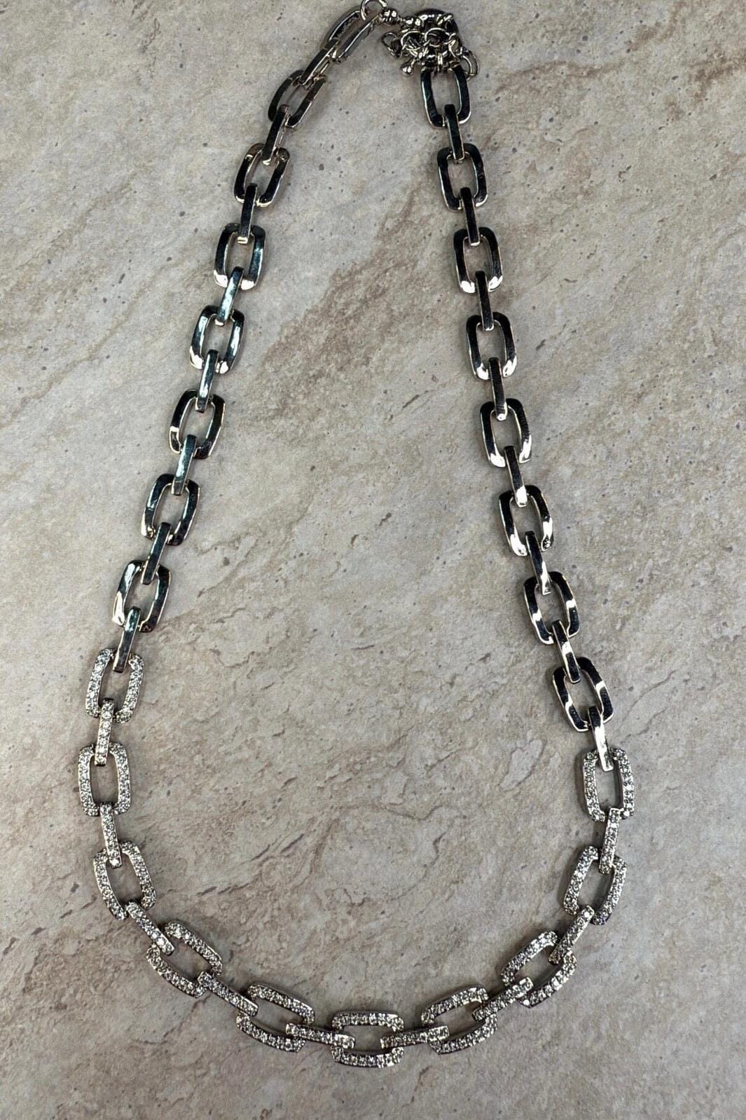 Forsølvet halskæde fra Molly&My Jewellery med store, rektangulære led. Nogle led er glatte, mens andre er dekoreret med små sten.
